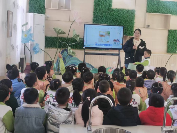 “小朋友们,你们知道为什么洗手能赶走细菌吗?”活动一开始,志愿者通过生动有趣的PPT和实物展示,向孩子们讲解肥皂的清洁原理和洗手的重要性。结合卡通图片和互动提问,孩子们迅速被吸引,积极参与问答,现场气氛轻松活泼。