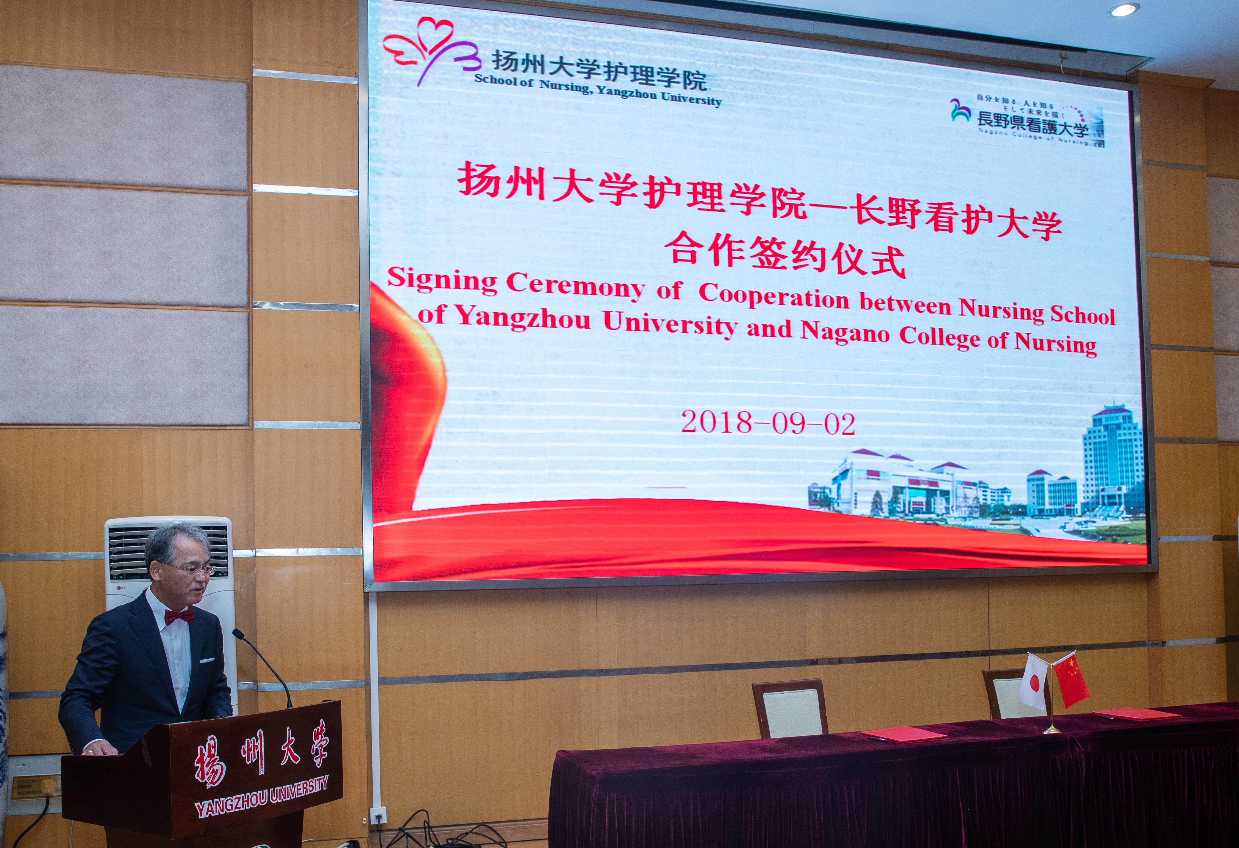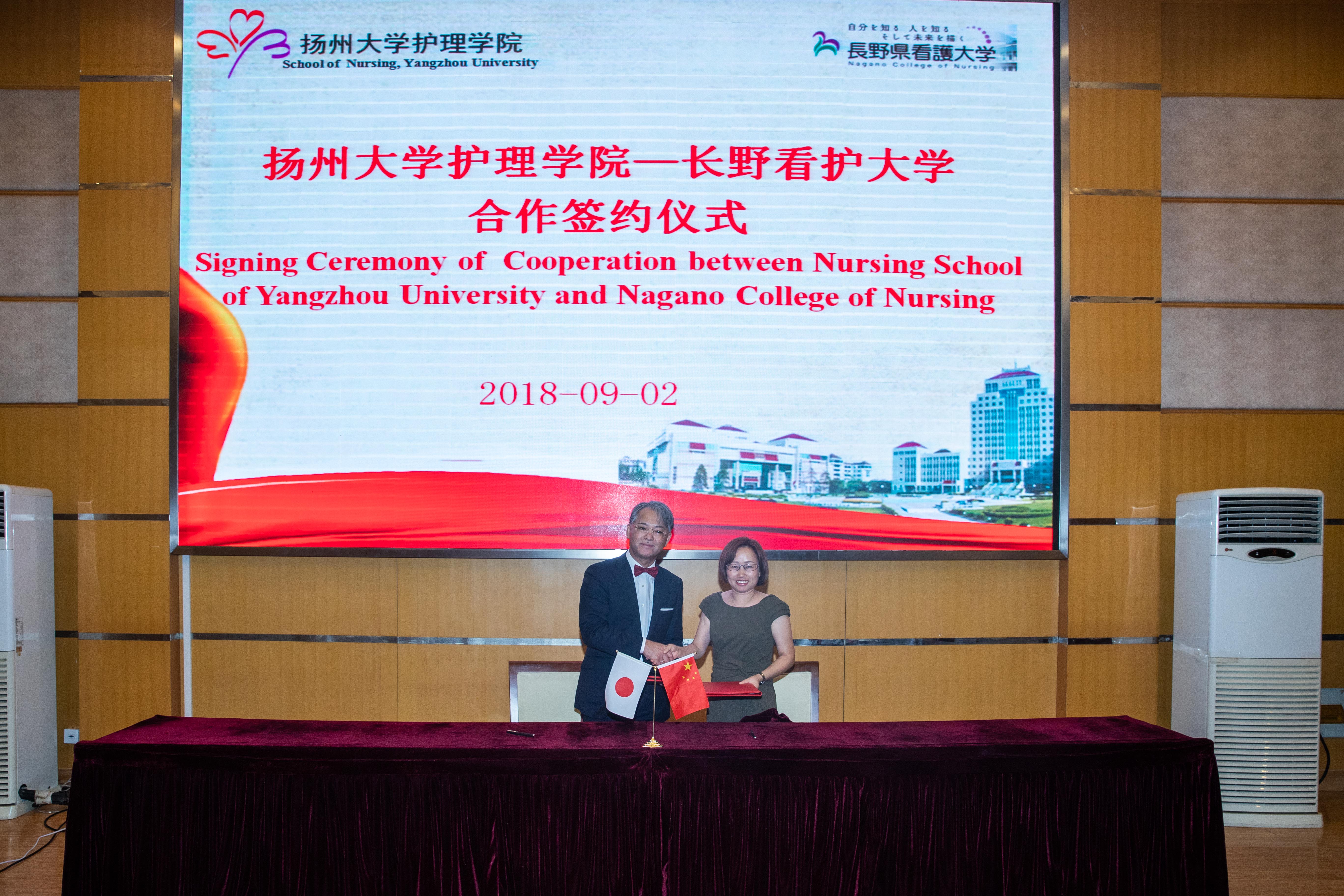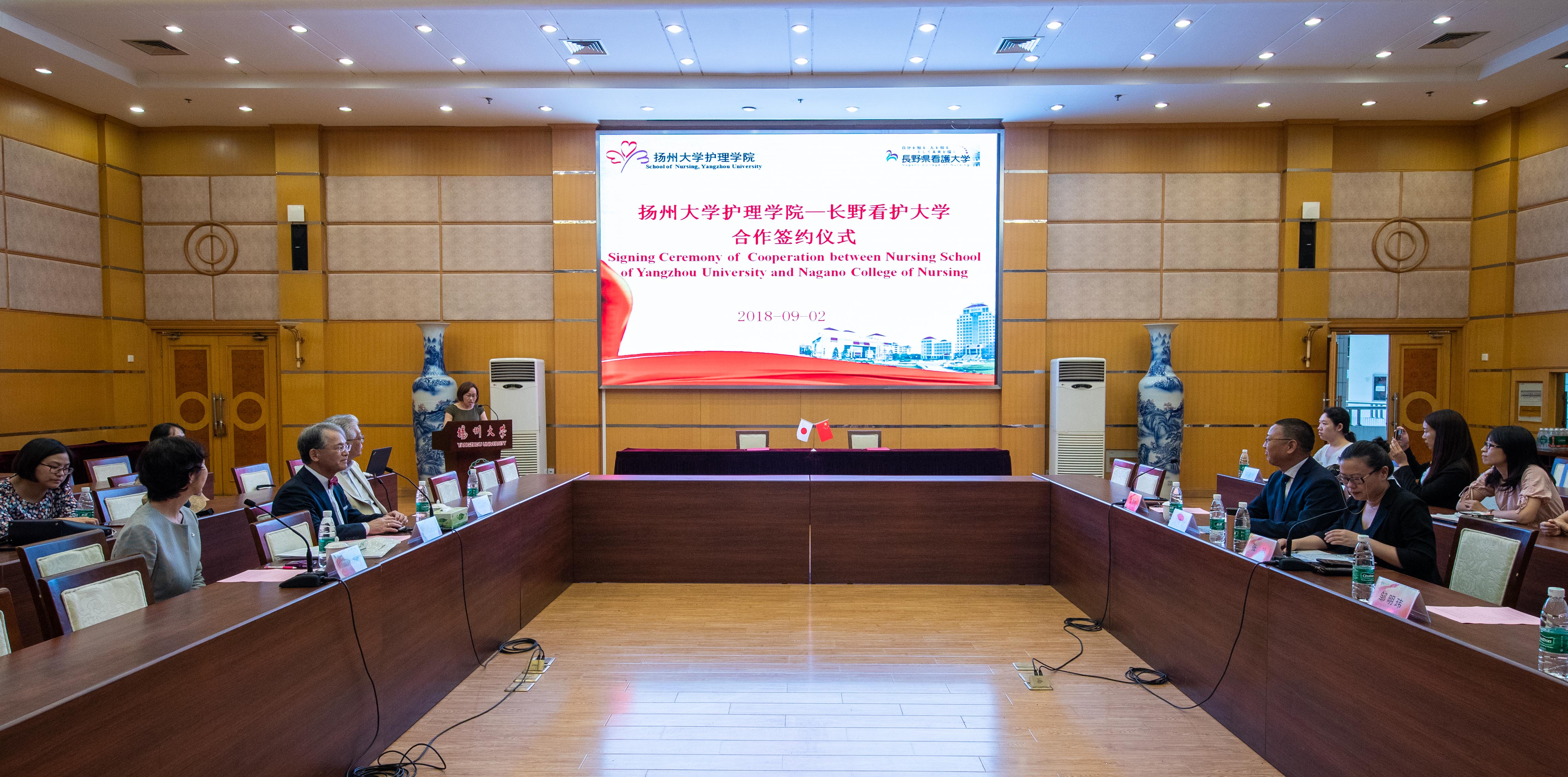 9月2日下午,扬州大学护理学院与日本长野县看护大学合作签约仪式在扬州大学荷花池主楼二楼多功能厅举行。出席嘉宾有日本长野县看护大学校长北山秋雄教授、日本长野县看护大学基础医学领域乔炎教授、日本岐阜县看护大学护理系主任北山三津子教授、扬州大学护理学院党委书记刘佩健、扬州大学护理学院院长龚卫娟教授、扬州大学国际合作与交流处副处长张吟、扬州大学医学院梁景岩教授,护理学院全体教职工参加签约仪式。