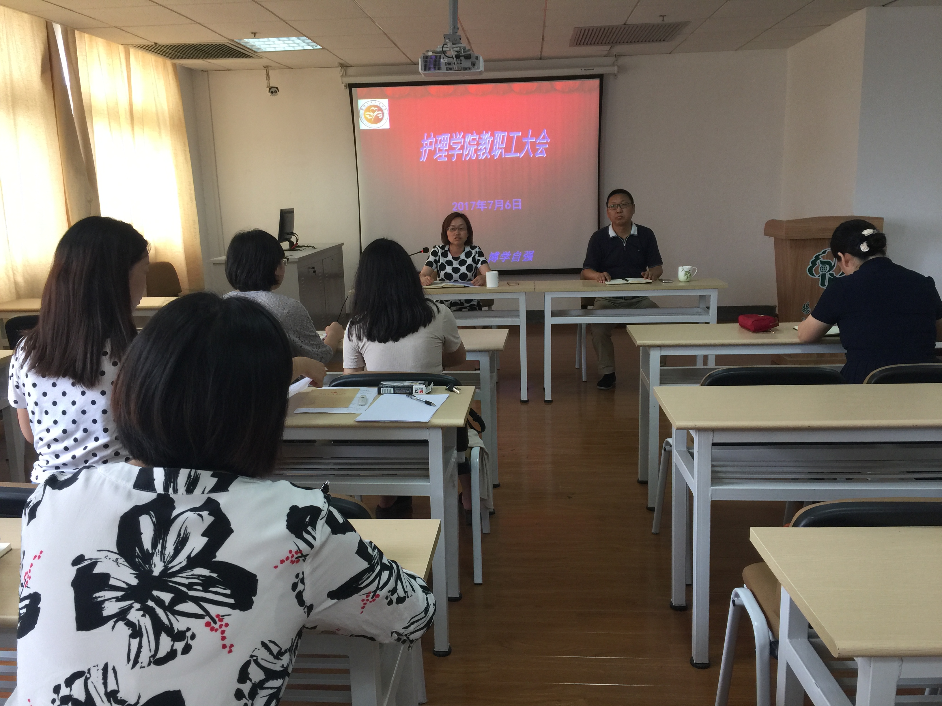 7月6日下午,护理学院召开教职工大会,龚卫娟院长回顾并总结了学院2017年上半年的工作,对人事工作、科研工作、本科教学、研究生教育、专业学位点申报、学生工作、继续教育等各项工作逐一进行分析,总结了目前取得的成绩,肯定了全院教职工对学院工作的投入与支持,并对2017年下半年的工作重点进行了梳理。龚院长对我院引进的6位新教师致欢迎词,布置了新教师下阶段的工作任务,希望她们尽快熟悉学院的各项工作并做好个人的职业规划。