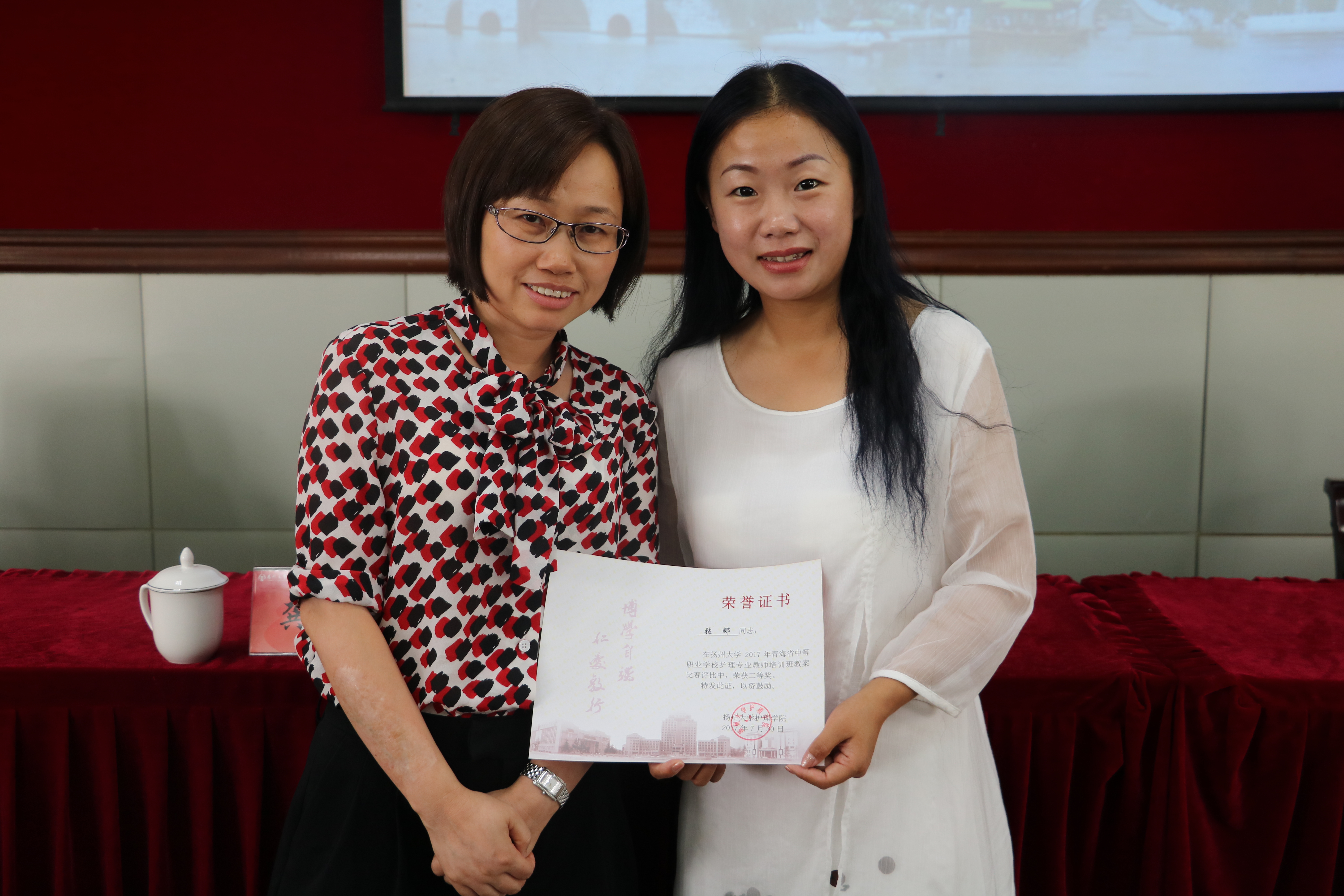 7月30日下午,青海省2017年中等职业学校护理专业教师培训班结业仪式在扬州大学荷花池校区行政楼一楼报告厅举行,出席领导与嘉宾有扬州大学护理学院党委刘佩健书记和扬州大学护理学院龚卫娟院长,仪式由扬州大学护理学院廖月霞老师主持。