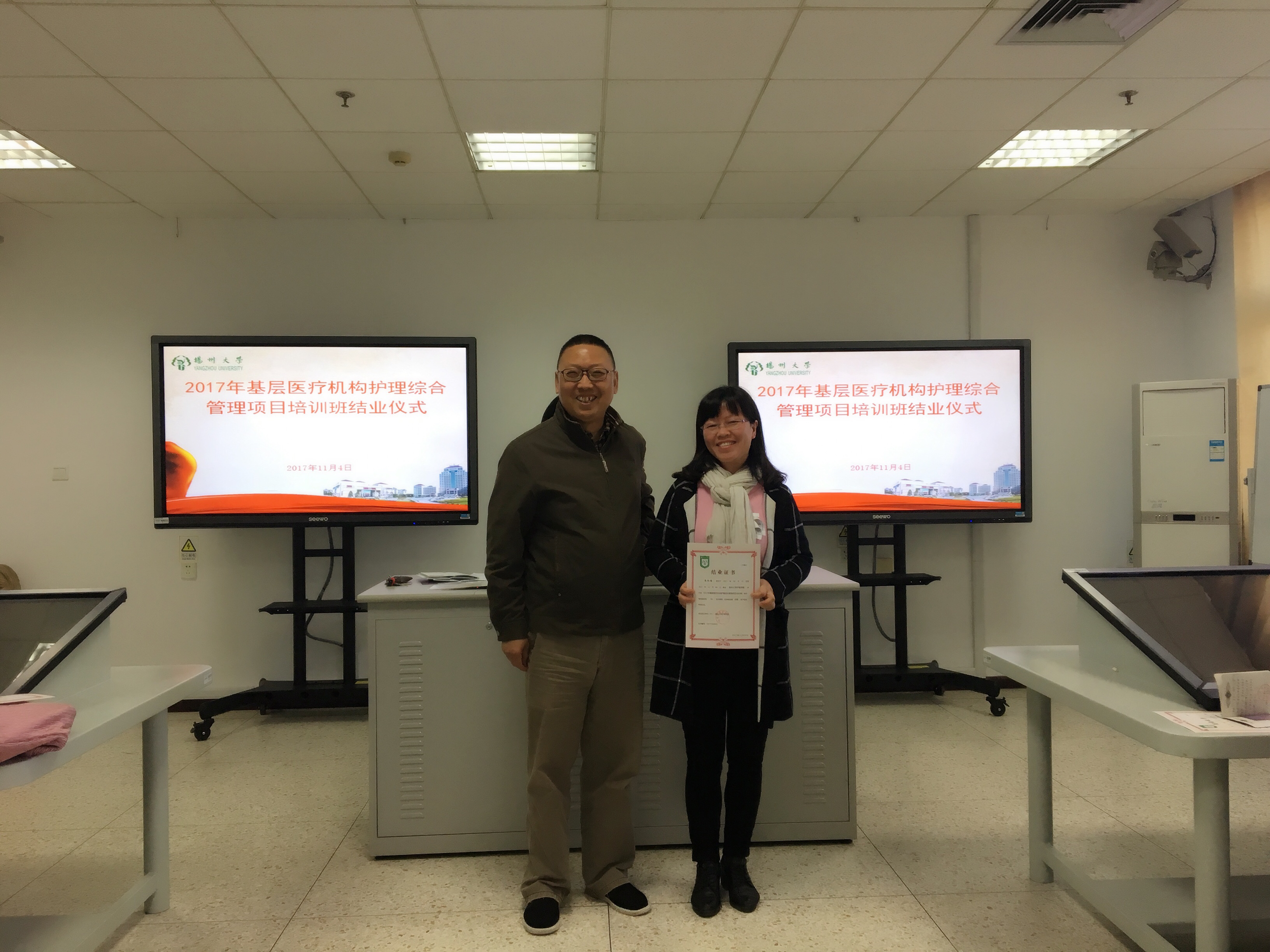 11月4日上午,我院在逸夫图书馆二楼PBL教室举办了基层医疗项目管理培训班结业仪式,护理学院党委书记刘佩健到会并为来自扬州市基层医疗机构22名护理管理者颁发了结业证书。