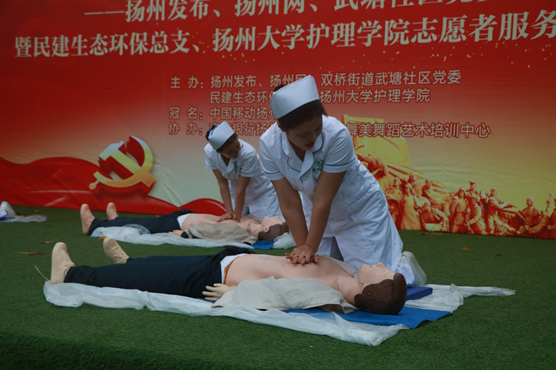 首先进行的是民建生态环保总支部-扬州大学护理学院志愿服务站共建揭牌仪式。进行揭牌的有扬州大学护理学院党委书记刘佩健,民建扬州市委副调研员徐跃,民建扬州市委委员、广陵区总支部主委黄红兴,武塘社区党委书记蒋建平四位领导。随后护理学院的学生代表为大家带来了心肺复苏术的演示。她们的操作熟练准确,动作整齐划一,获得了观众的一致喝彩。专业化的水平和熟练的操作让5位身着白衣的志愿者同学在台上熠熠生辉。