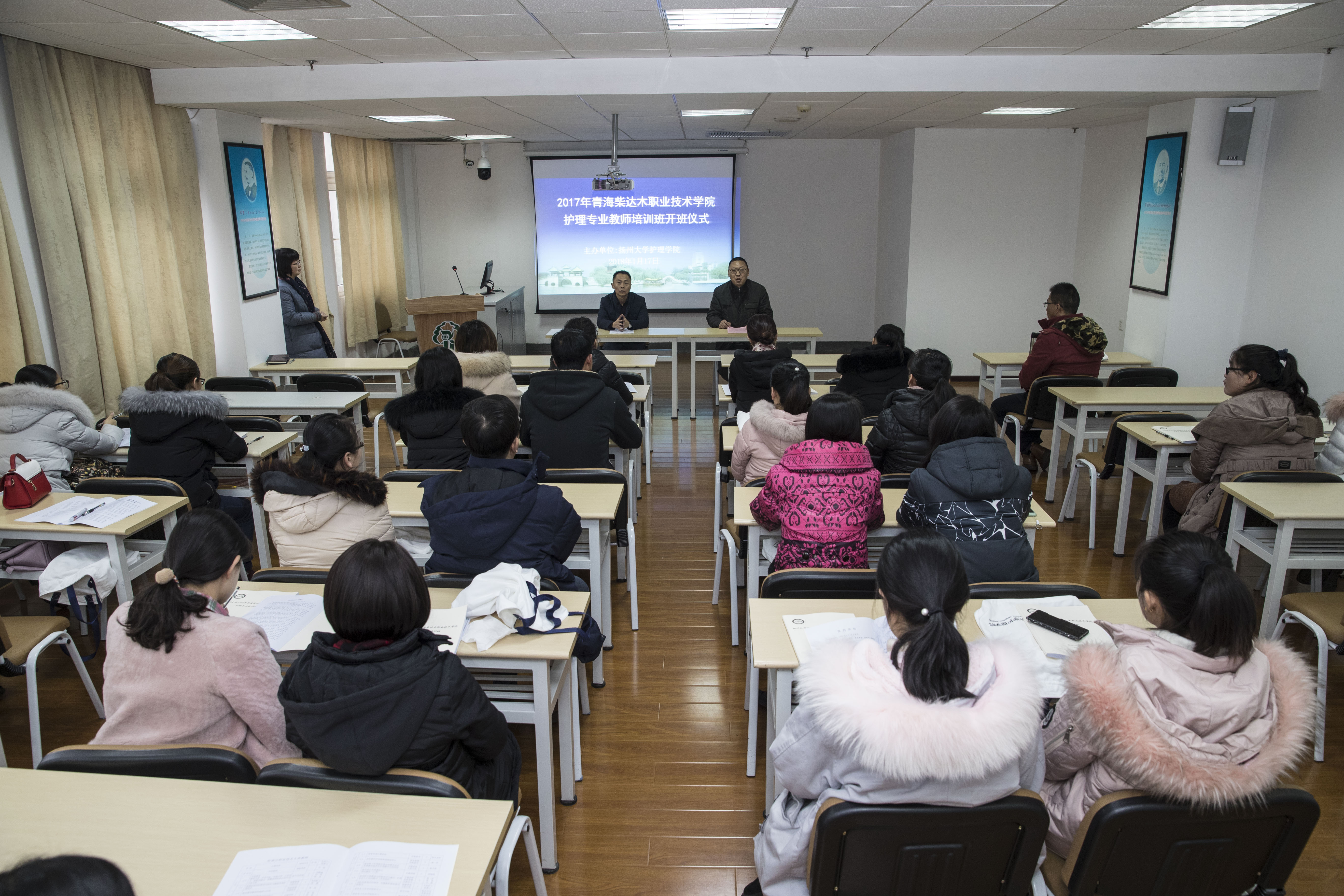 1月17日上午,2018年青海省柴达木职业技术学院护理专业教师培训班开班仪式在逸夫图书馆三楼示教室正式举行,仪式由护理学院廖月霞老师主持,学院党委刘佩健书记出席仪式并发表讲话。刘书记简要描述了扬州历史人文特色后,详细介绍了扬州大学发展历史及护理学院的基本概况,并强调了培训过程中应遵循的基本原则、规章制度以及任务安排,希望所有学员能在收获真知和提升技能的基础上,了解扬州悠久的历史文化根源以及风土人情,满载而归。