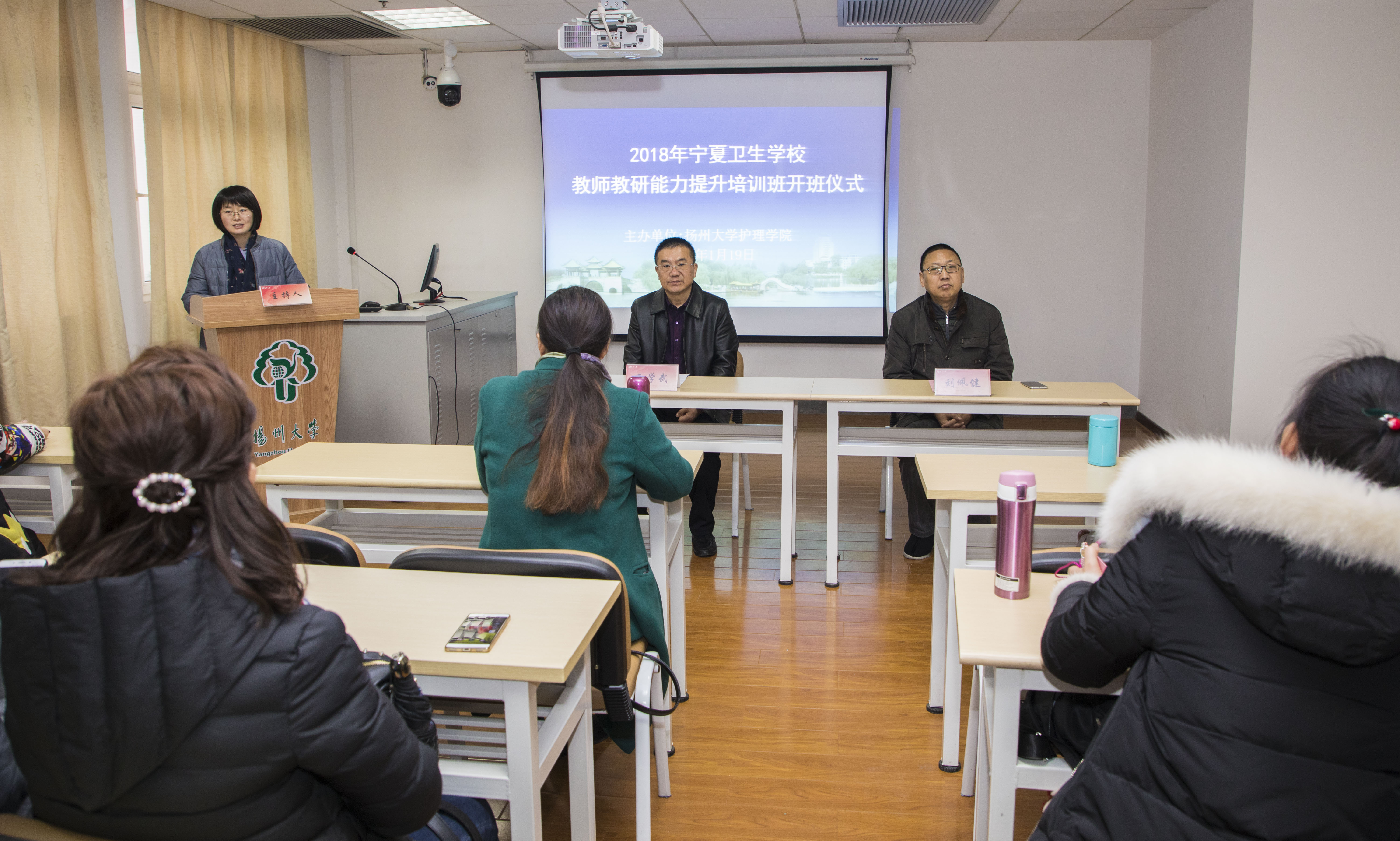 1月19日上午,2018年宁夏卫生学校教师教研能力提升培训班开班仪式在逸夫图书馆三楼示教室正式举行,仪式由护理学院廖月霞主持,学院党委刘佩健书记出席仪式并发表讲话。刘书记先后详细介绍了扬州的历史人文特色、扬州大学发展历史与优势、护理学院基本概况及重点发展方向,随后着重强调了在此次培训过程中,学员们应遵循的培训基本原则、规章制度以及为期两周的任务安排,希望所有学员能在了解扬州悠久的历史文化根源以及风土人情的基础上,收获真知和提升教学科研技能。