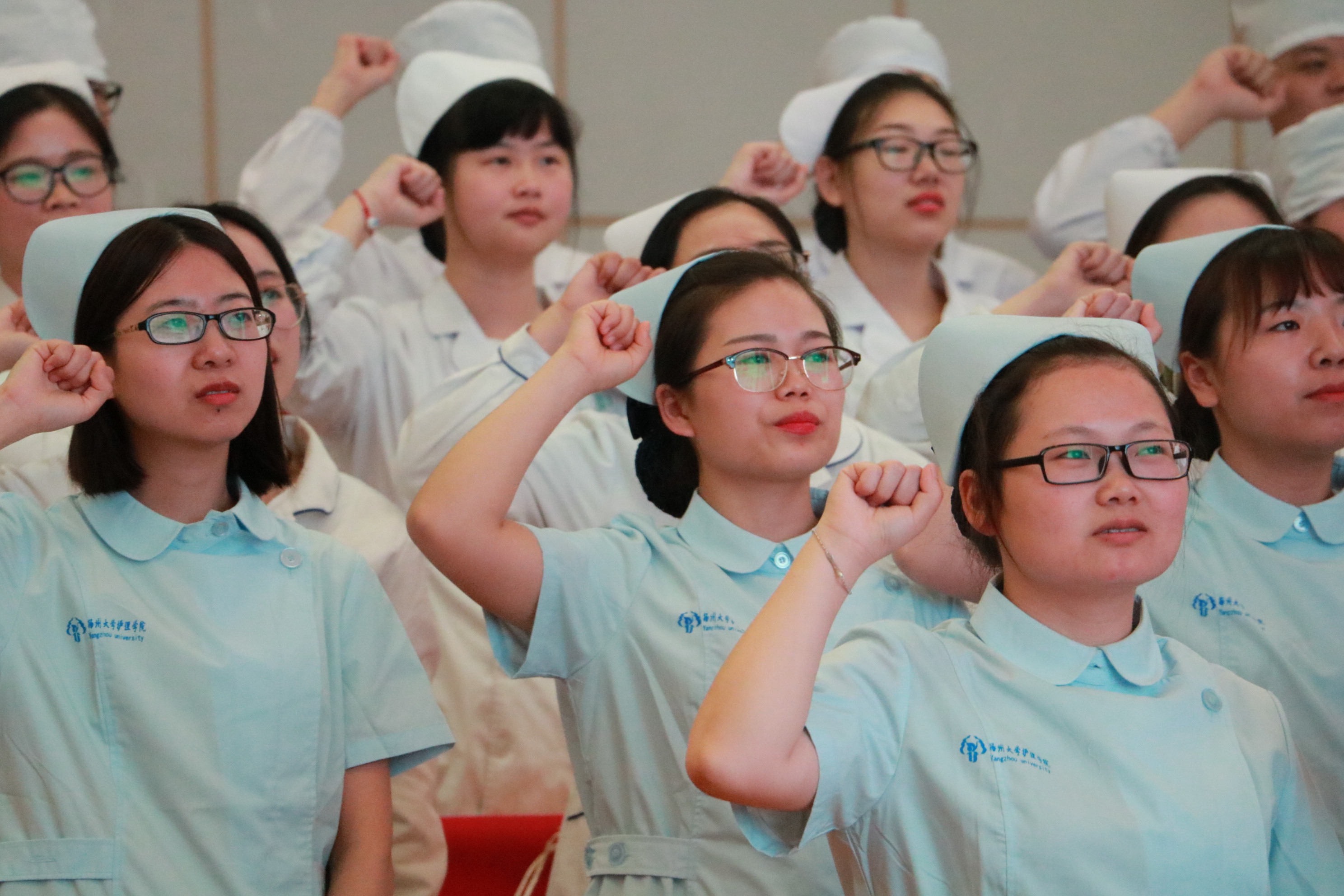 第一个环节是授帽仪式,仪式开始前播放了2018届学生四年大学生活照片及视频,影片带着毕业生们追忆了从军训一路走来的历程。授帽仪式上七人为一组,依次走上台将手中的燕尾帽递给教师,左脚半退,身体半蹲,由教师为他们戴上洁白的护士帽,承担下老师们的期许以及护士这一行业的职责。授帽结束,全体2018届毕业生起立,举起右手,庄严宣誓,表达对自己选择护理这个崇高行业的坚定之心。