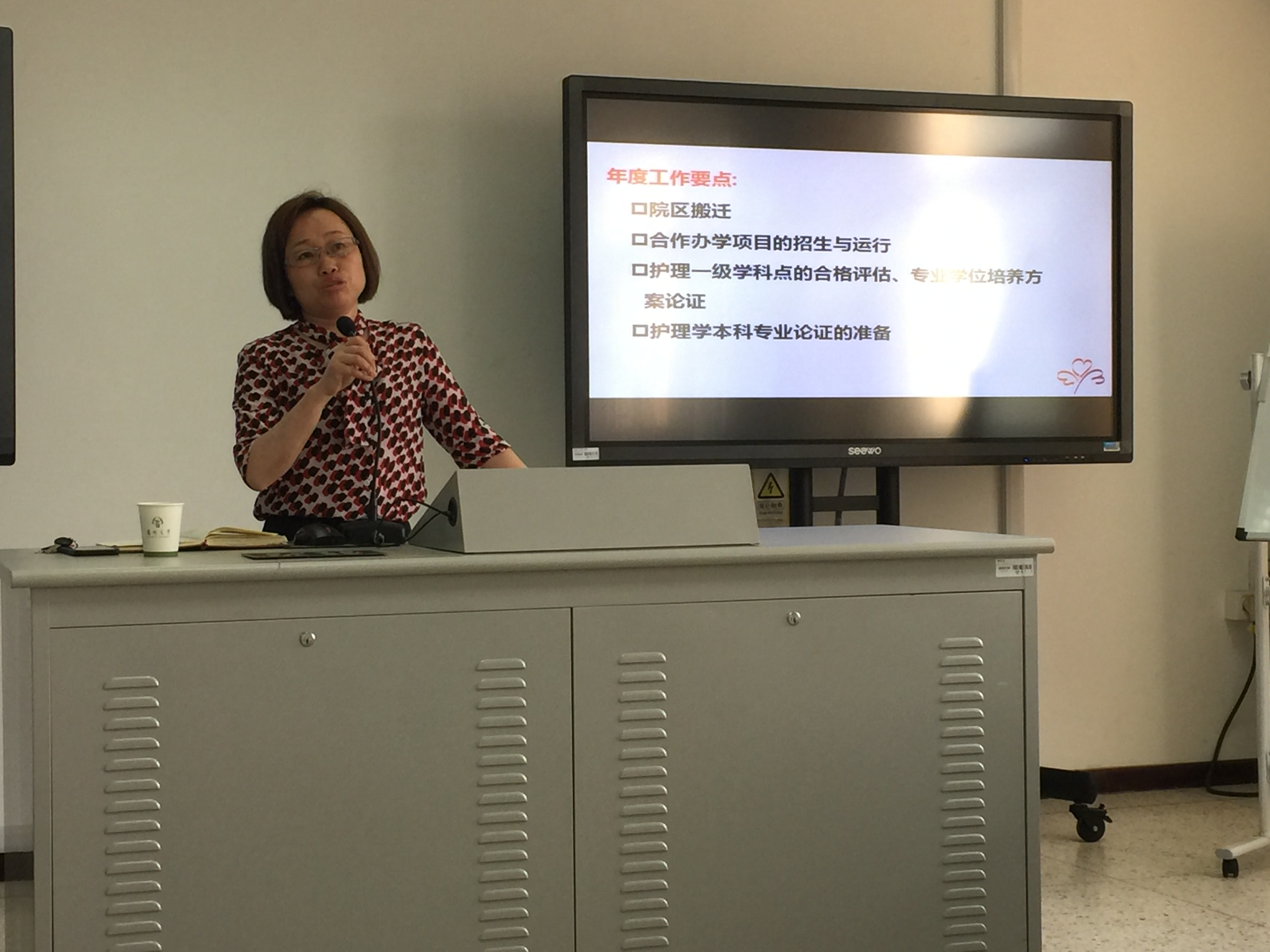 5月15日下午,护理学院召开全院教职工大会,龚卫娟院长布置本学期的重点工作,包括校区搬迁、中外合作办学项目的招生与运行管理、护理一级学科点合格评估、专业学位培养方案的论证、护理学本科专业论证的准备工作等。龚院长重点解读了2018年度学院发展业绩量化指标,详细分析了教学工作、本科生与研究生培养、学科建设、人事师资、自然科学、学生工作等各项指标,总结了学院目前的特色和存在的不足,对2018年下一步的总体工作做了简要部署。
