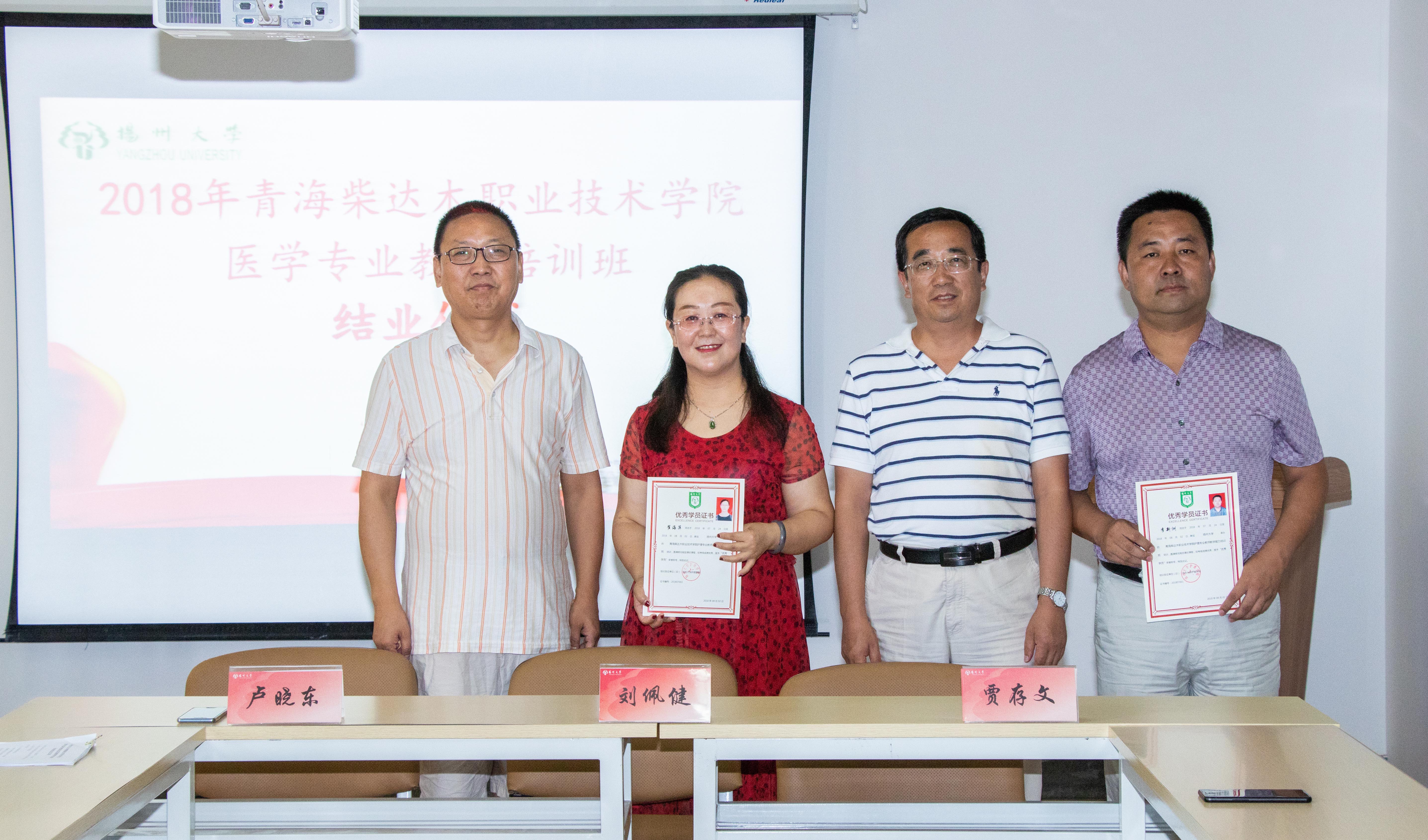 随后由扬州大学护理学院党委刘佩健书记和格尔木市人民医院党委贾存文书记共同为格尔木市第二人民医院李新洲副院长和海西州人民医院护理部崔海萍主任两位学员颁发优秀学员证书,由刘佩健书记为每位学员颁发结业证书并合影,学员们可谓是满载收获、硕果累累。