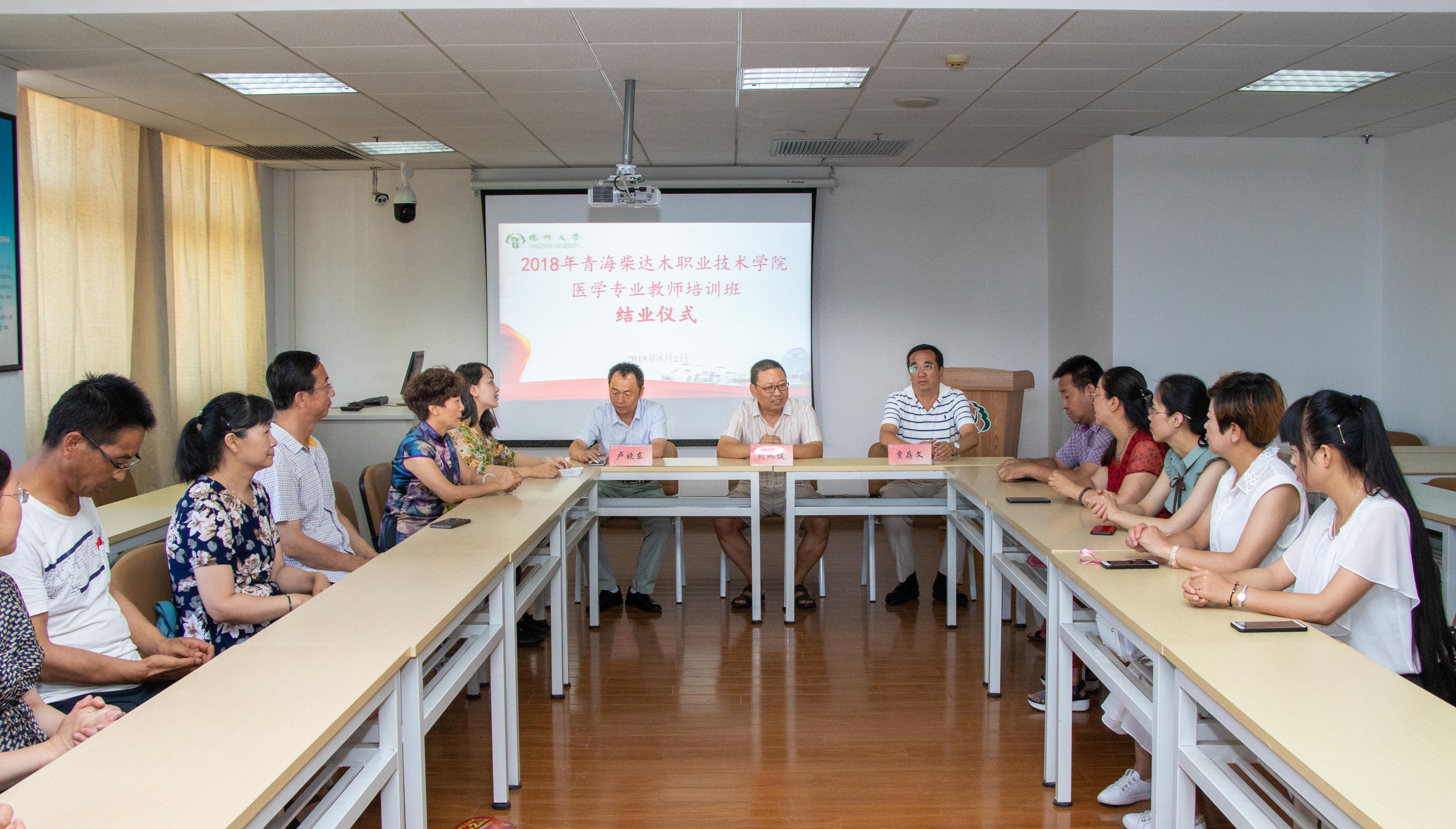 8月2日上午,扬州大学护理学院扬州大学2018年青海柴达木职业技术学院医学专业现代学徒制试点项目教师教学能力提升培训班结业典礼在扬州大学荷花池校区逸夫图书馆三楼会议室举行,出席领导与嘉宾有扬州大学护理学院党委书记刘佩健、青海柴达木职业技术学院医学系主任卢晓东、格尔木市人民医院党委书记贾存文以及青海省柴达木职业技术学院教师培训班全体学员,仪式由扬州大学护理学院师亚老师主持。