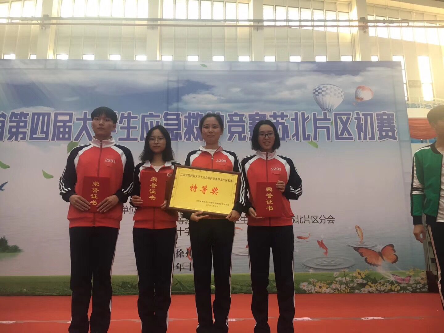10月18日,江苏省第四届大学生应急救护竞赛苏北片区初赛在徐州举行。我校代表队获得了特等奖的好成绩。比赛为单人徒手心肺复苏和创伤急救两部分。我校参赛队员陈苏闵、薛智超、季之遇、申金钰以娴熟的操作、沉着的姿态从24支队伍中脱颖而出,得到评委的认可。