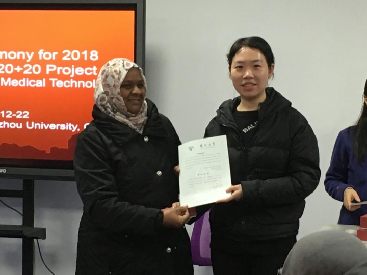 由教育部主办,我院承办的“中非20+20合作计划”—现代医学技术(护理学)培训项目于12月22日在我院圆满结束,国际交流与合作办公室主任祝娉婷为苏丹学员颁发了项目证书。