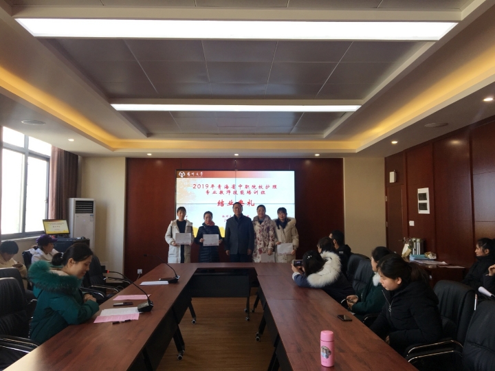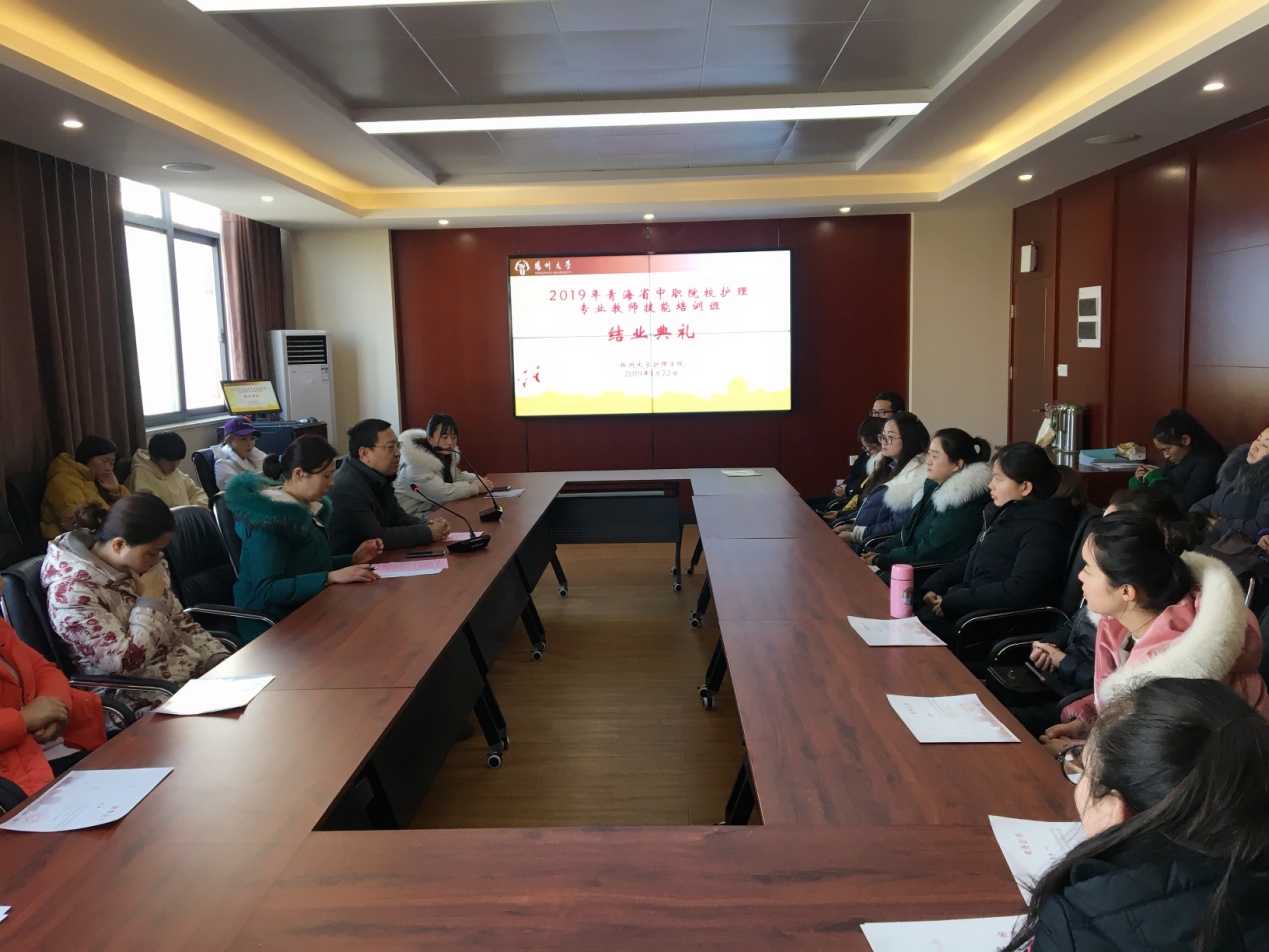 1月22日下午,扬州大学2019年青海省中职院校护理专业教师技能培训班结业典礼在毓贤楼四楼会议室隆重举行,继续教育办公室主任马莉主持会议,院党委书记刘佩健出席会议,青海省各中职院校护理专业学员参加会议。