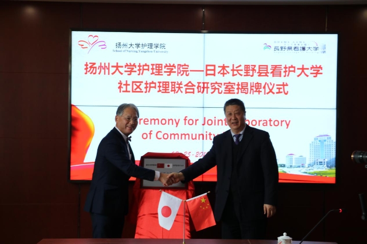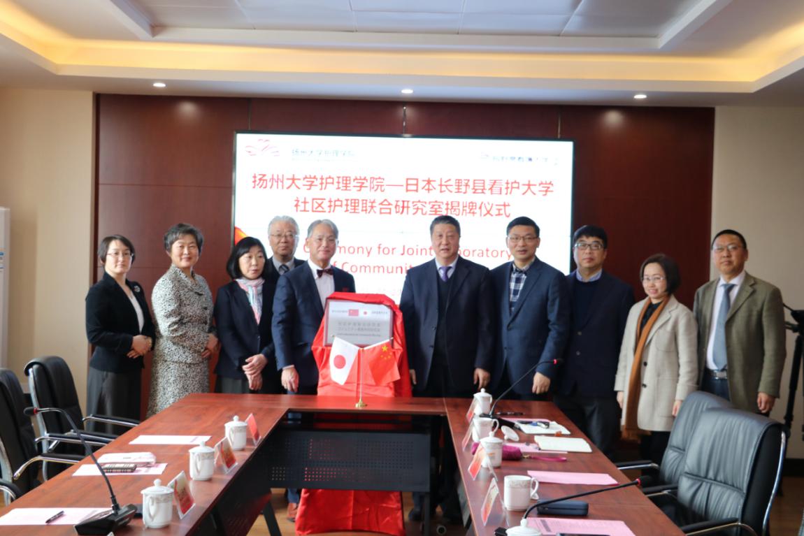 3月25日上午,扬州大学护理学院与日本长野县看护大学共建社区护理研究室揭牌仪式在毓贤楼四楼会议室举行。出席嘉宾有扬州大学副校长陈国宏教授、日本长野县看护大学校长北山秋雄教授、日本长野县看护大学副校长渡边教授、日本长野县看护大学乔炎教授、细田女士、曾根女士、扬州大学科技处处长刘巧泉教授、扬州大学国际处处长秦旭教授、扬州大学护理学院党委书记刘佩健先生、扬州大学护理学院院长龚卫娟教授,护理学院全体教师参加揭牌仪式。