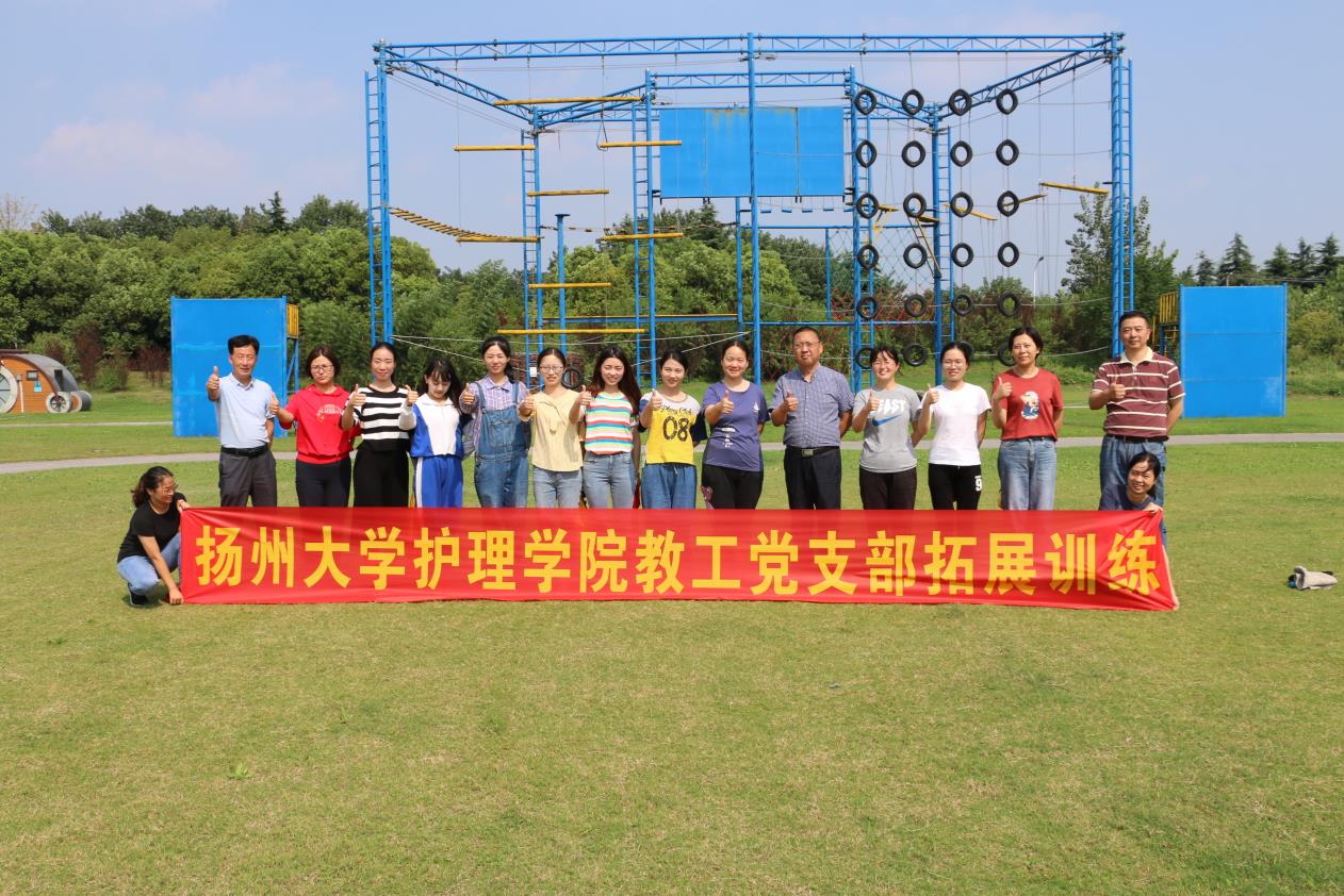 2019年9月7日早上8点,扬州大学护理学院教工党支部以“不忘初心,凝心聚力,坚定信心”为主题的户外素质拓展活动在扬州市体育拓展训练基地顺利举行。护理学院教工党支部全体成员共16人参加了此次活动。在活动开始,全体党员分为两组,建立团队文化并进行团队文化展示,用特殊的形式相互了解,团队成员间初步形成热烈的团队氛围。