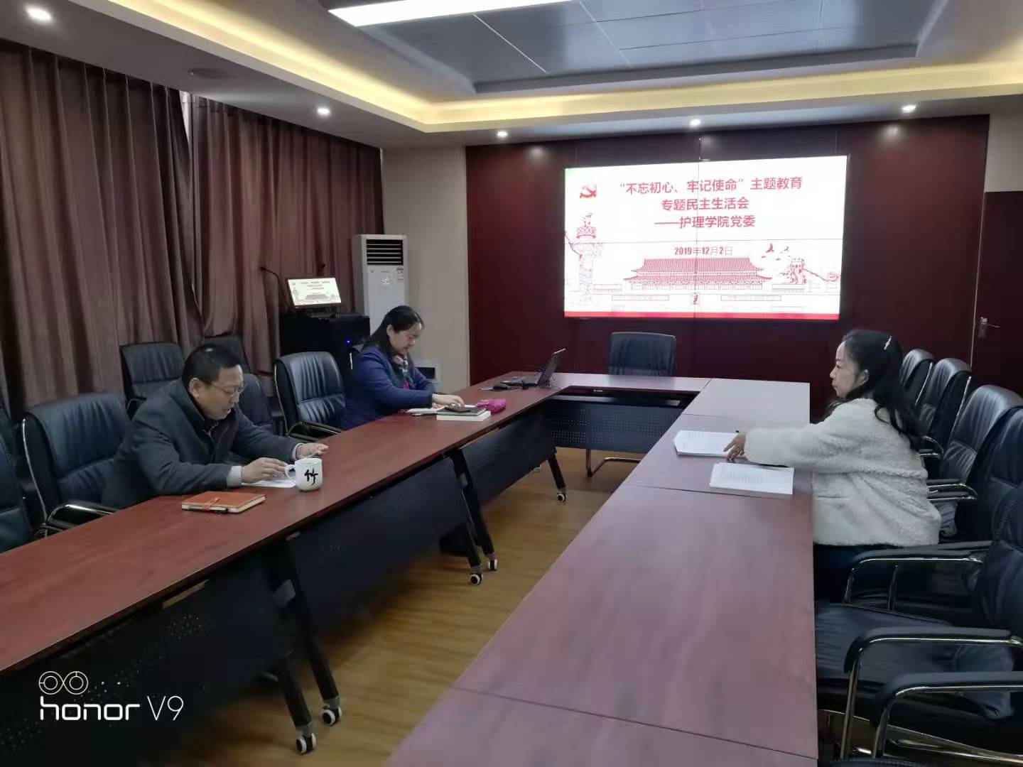 12月2日下午,护理学院召开“不忘初心、牢记使命”主题教育专题民主生活会,院党委委员参加领导班子民主生活会,院党委书记刘佩健主持会议。会上,刘书记首先带领大家学习了省委主题教育领导小组文件(苏教组发[2019]16号)和中央《关于第一批主题教育单位开好“不忘初心、牢记使命”专题民主生活会的通知》等文件精神。接着刘书记代表学院党委领导班子作检视剖析汇报,深入查摆在“思想、政治、作风、能力、廉政”5个方面存在的突出问题。随后,班子成员逐个作检视剖析、开展批评与自我批评,提出改进建议。