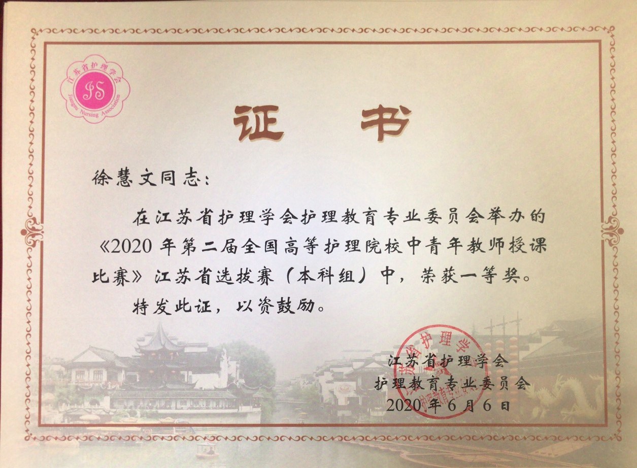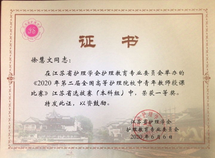 此次选拔赛采用提交课堂实录视频的形式,共有10所本科院校报名参赛,其中选出2所院校代表江苏省参加全国比赛。6月8日,比赛结果公布,我院徐慧文老师的作品《刮痧》荣获江苏省选拔赛一等奖,获得“2020年第二届全国高等护理院校中青年教师授课比赛”参赛资格。
