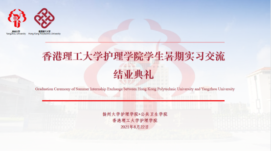 8月22日下午,我院顺利举行同香港理工大学护理学院学生暑期实习交流总结汇报暨结业典礼。出席本次活动的嘉宾有扬州大学护理学院·公共卫生学院副院长刘永兵教授、香港理工大学海外交流活动联络主任冯宪基老师、扬州市中医院护理部主任魏金荣老师、学院国际交流与合作办公室主任祝娉婷老师、团委副书记徐慧文老师、扬州大学旅游烹饪学院朱云龙教授、扬州市中医院和我院部分教师、香港理工大学和我院护理学专业学生。