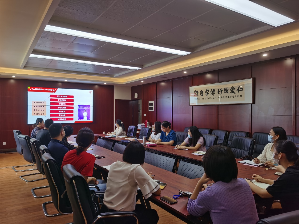 座谈会上,2022年“金讲台”奖获得者—祝娉婷老师分享了从教经验,从教学的十项能力、课程思政在教学中的作用、育德能力和育德意识提升方法、课堂教学的主渠道等几个方面解读了新时代教师的使命和担当。