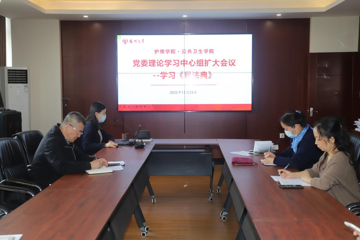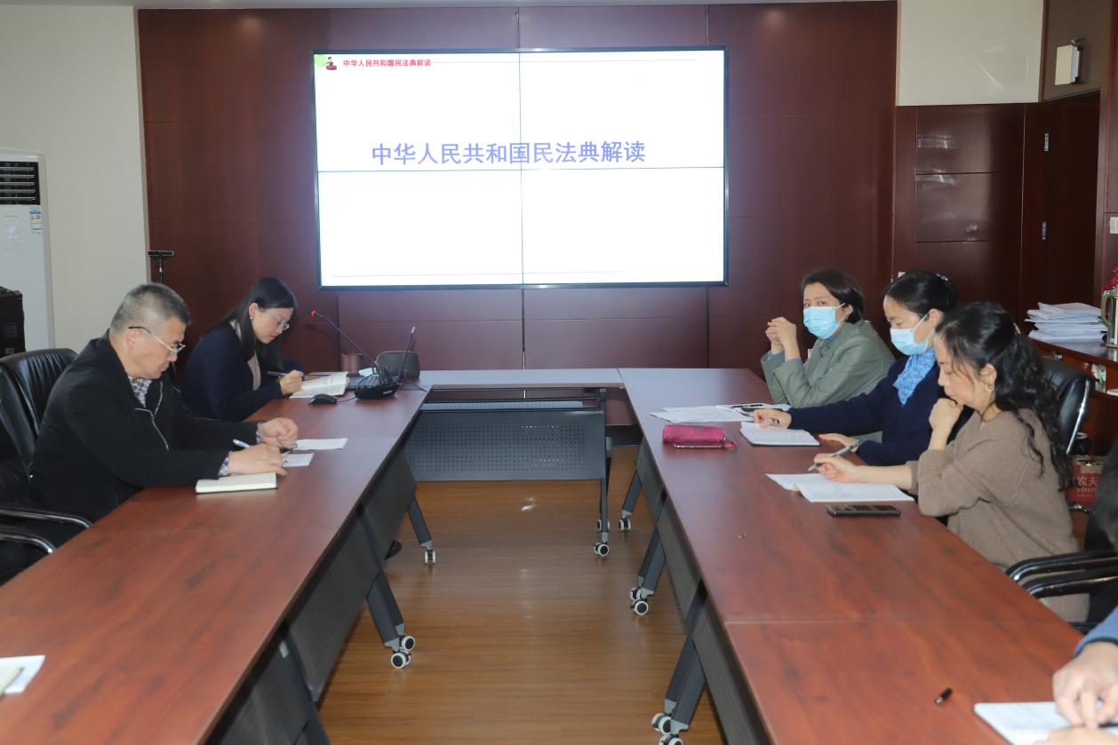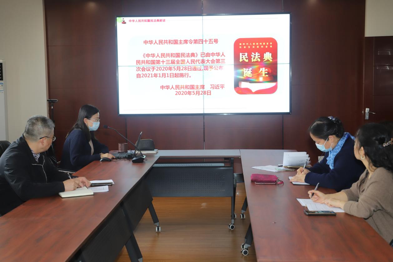 11月23日下午,我院党委理论学习中心组举行扩大会议,集中学习《民法典》。院党委副书记邹明玮作学习报告,院党委委员,副院长祝娉婷作主题发言,全体教职工参加此次学习会议。