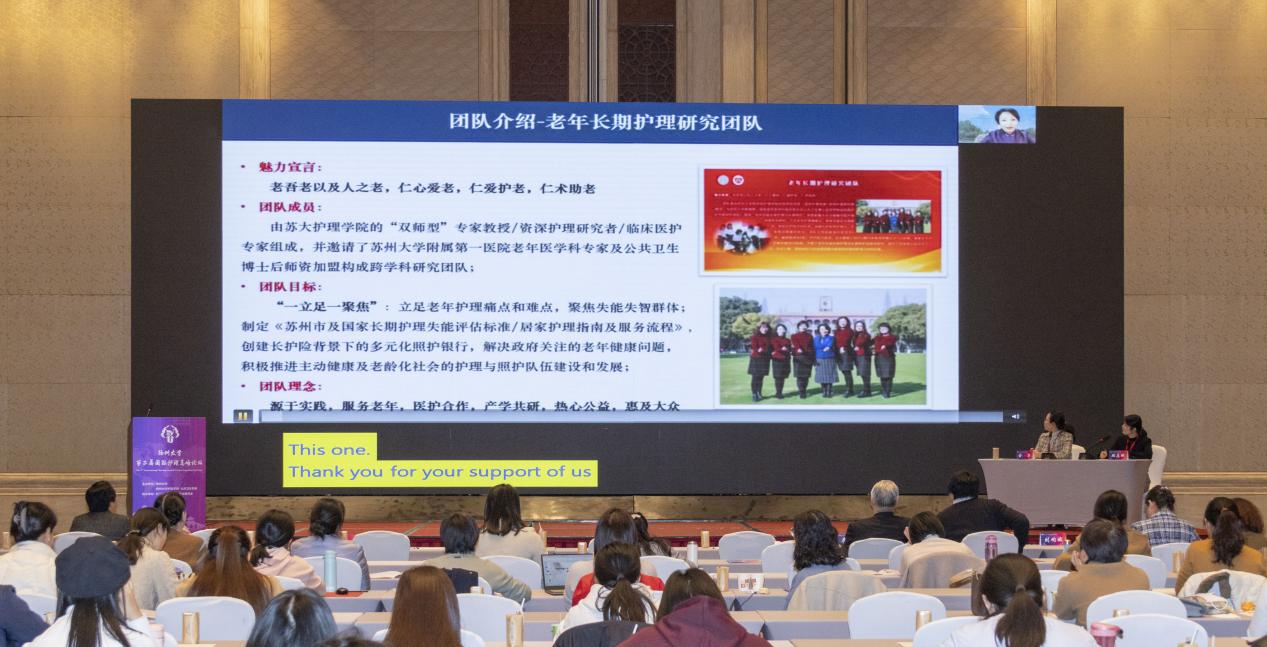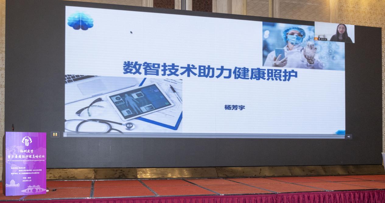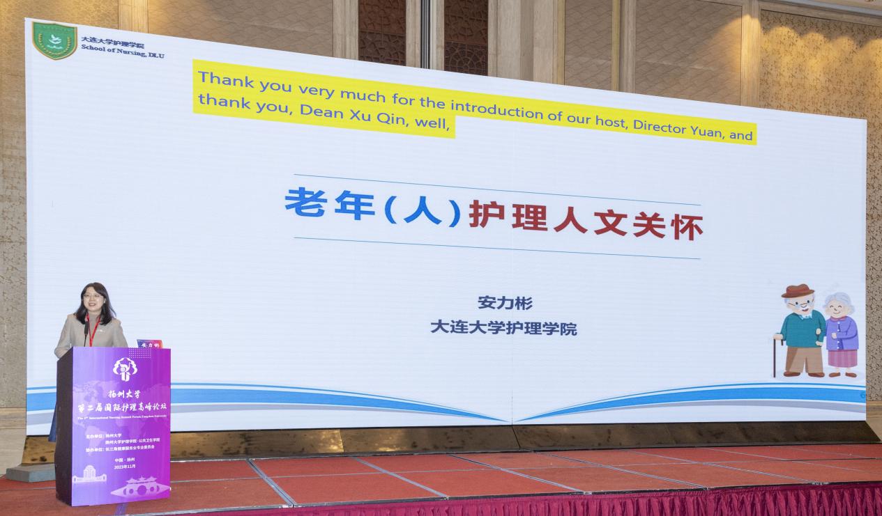 开幕式由扬州大学护理学院·公共卫生学院院长郑英主持,扬州大学党委书记焦新安、副校长龚卫娟、北京大学护理学院院长、教育部高等学校护理学类专业教学指导委员会主任委员尚少梅、教育部高等学校护理学类专业教学指导委员会秘书长孙宏玉、美国林菲尔德大学圣玛丽安护理学院Ericka Waidley教授、日本长野县看护大学乔炎教授、泰国东方大学研究生院院长Nujjaree Chaimongkol、香港理工大学护理学院副院长梁绮雯、香港大学护理学院王文炳教授、首都医科大学护理学院院长刘均娥、大连大学护理学院院长安力彬、南京医科大学护理学院院长许勤出席论坛。复旦大学护理学院院长胡雁、苏州大学医学院护理学院院长李惠玲、首都医科大学护理学院党总支副书记杨芳宇线上参会。长三角健康服务业专委会上海、滁州、马鞍山、湖州、嘉兴、苏州、淮安等城市有关部门、养老、医疗机构、扬州大学党委办公室、科学技术处、医学部、医学院、附属医院、附属苏北人民医院相关负责同志、护理学院·公共卫生学院全体教职工、临床兼职教师、护理专业研究生200余人参加活动。