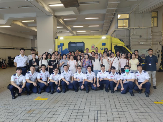 另外,我院学生还前往尖沙咀东救护站,了解到了香港的应急救护流程,对香港的初步急救处理有了一定的了解。现场的工作人员进行了角色扮演,为学生们演示了对心脏病病人的救护。值得一提的是,在需要做CPR的时候,会有专门的按压机器,不需要人工去按压,这使得救护的效率非常高。接下来,学生们还参观了香港的救护车,了解到其配备的各种救护设备。