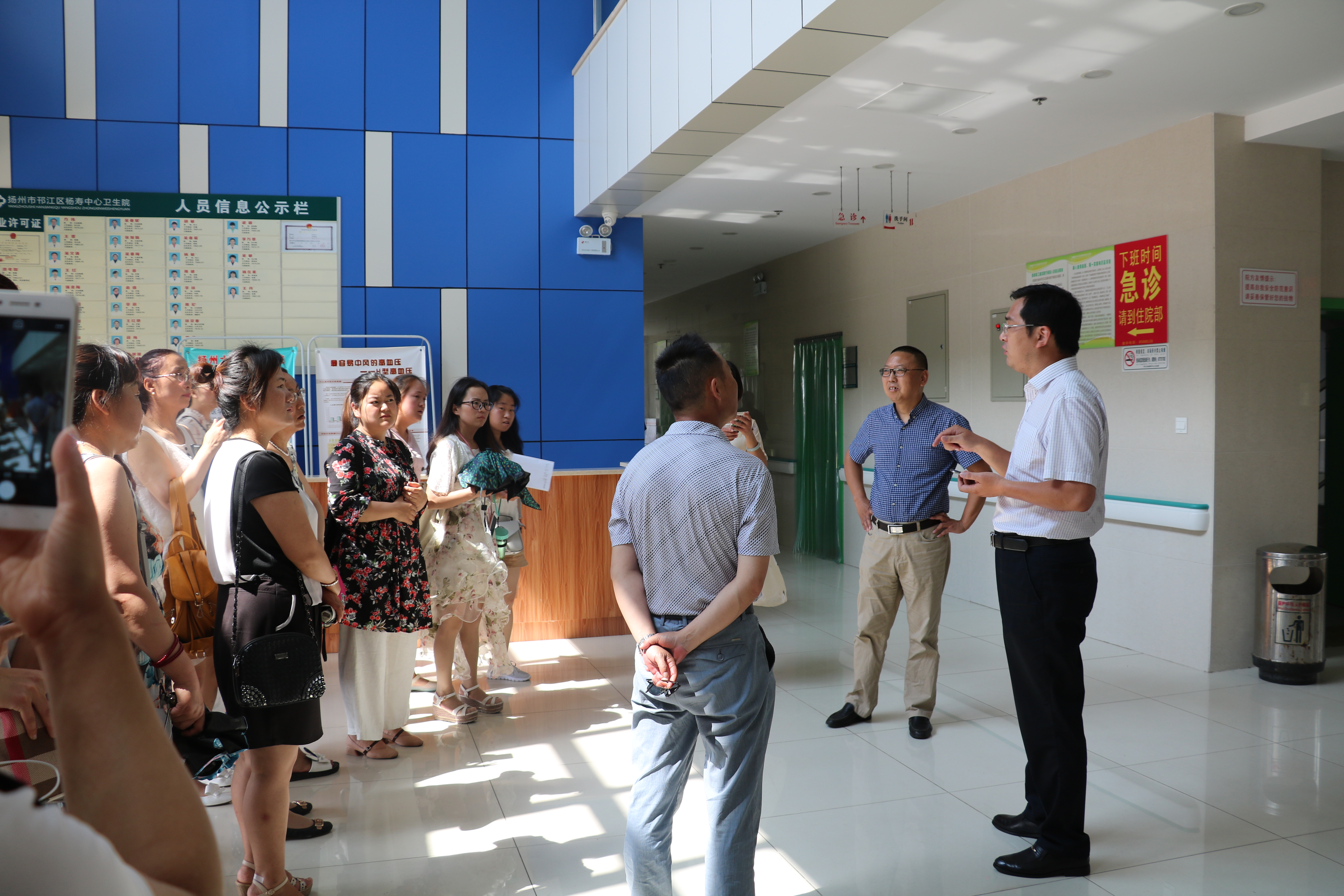 邗江区卫生和计划生育委员会陈焱副主任,亲临现场向学员们介绍卫生服务中心的发展历程,同时卫生服务中心池院长派工作人员向学员们介绍服务站基本情况与建设规模。学员们跟随工作人员依次参观了检验科、中医馆、妇女保健区、医生办公点、手术室、员工餐厅以及服务中心外部环境。参观期间,学员们与工作人员亲切交流与互动,从整体上熟悉了扬寿卫生服务中心的概况。
