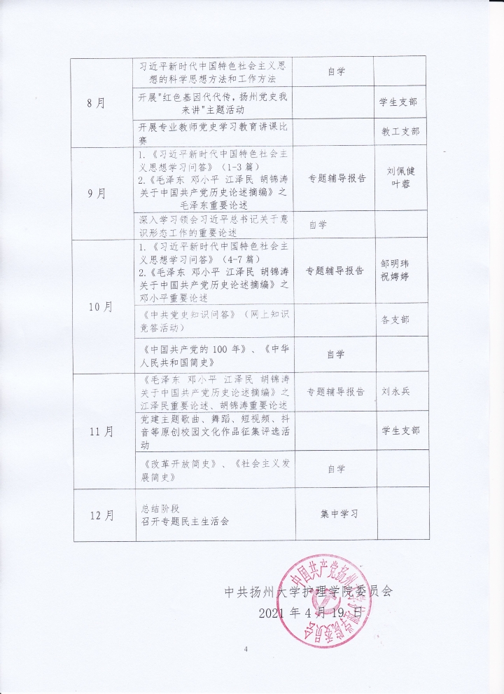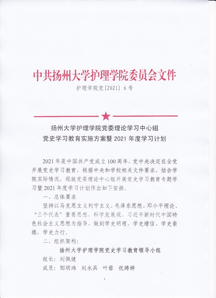 扬州大学护理学院党委理论学习中心组党史学习教育实施方案暨2021年度学习计划
