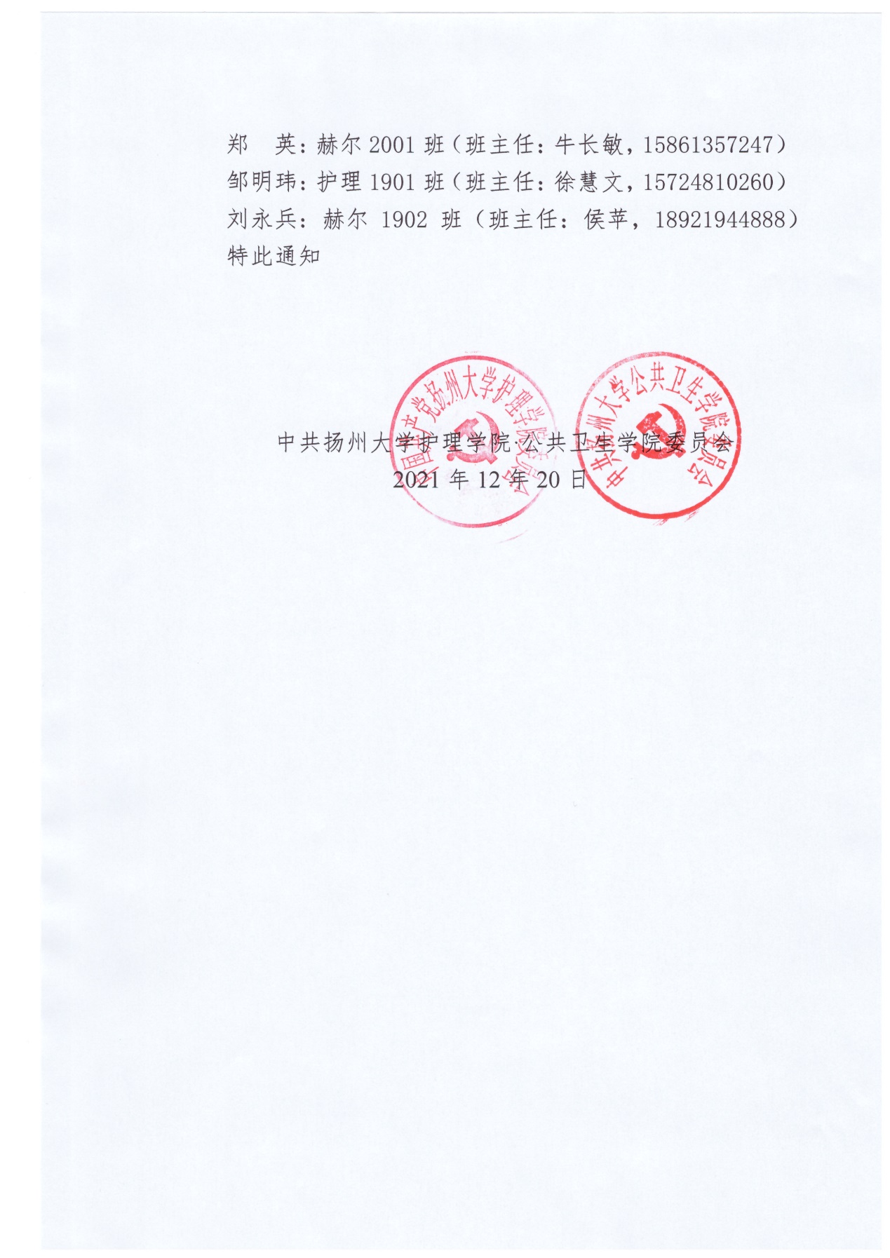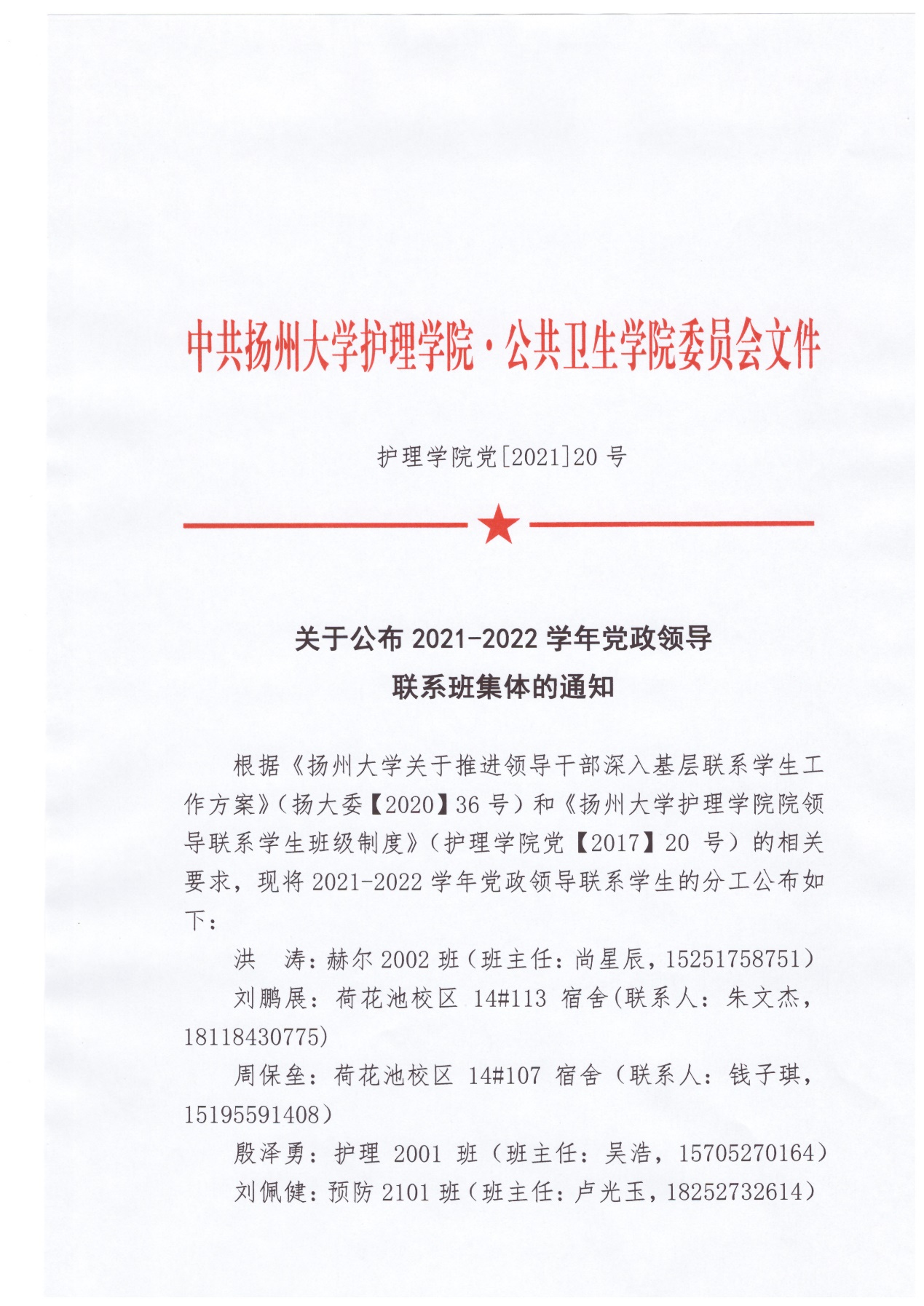 关于公布2021-2022学年党政领导联系班集体的通知