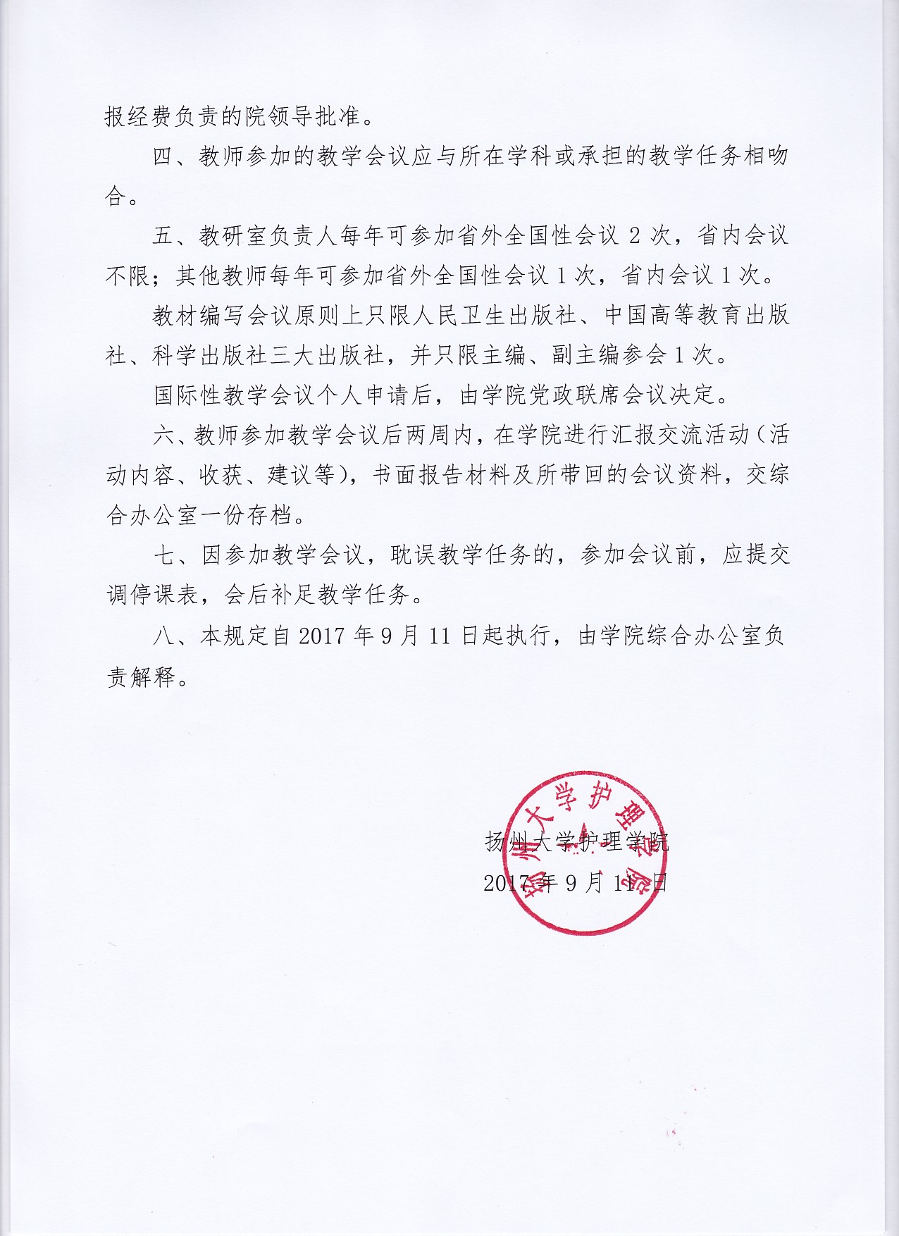 扬州大学护理学院关于教师外出参加教学会议的管理规定