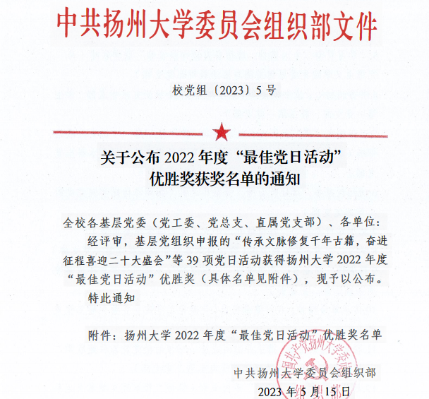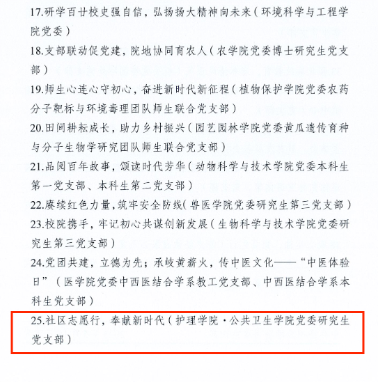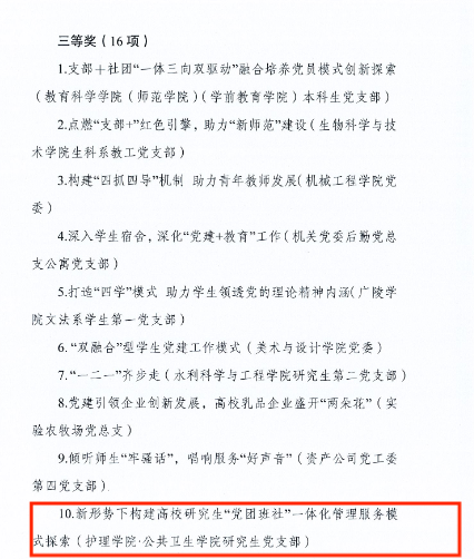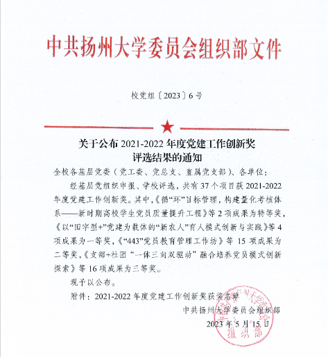 近日,校组织部公布2021-2022年度党建工作创新奖评选结果,我院研究生党支部申报的《新形势下构建高校研究生“党团班社”一体化管理服务模式探索》项目获党建工作创新奖三等奖;《社区志愿行,奉献新时代》获评“最佳党日活动”优胜奖。