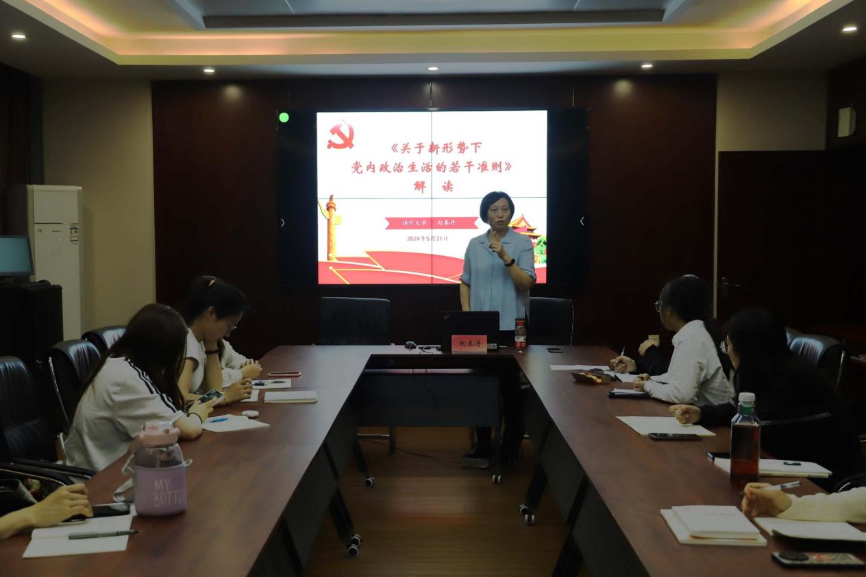 赵春丹作题为《关于新形势下党内政治生活的若干准则》专题讲座,从坚定理想信念、坚持党的基本路线、坚决维护党中央权威、严明党的政治纪律等方面对党内政治生活进行规范和介绍。讲座结合党内生活的一些突出问题,为此还引入了“一个坚持,四个着力”的要求进行讲解。强调要做到三个坚持,坚持“三会一课”制度、坚持谈话谈心制度、坚持对党员进行民主评议。强调必须要坚定理想信念,把马克思主义的信仰、对社会主义和共产主义的信念作为毕生追求。