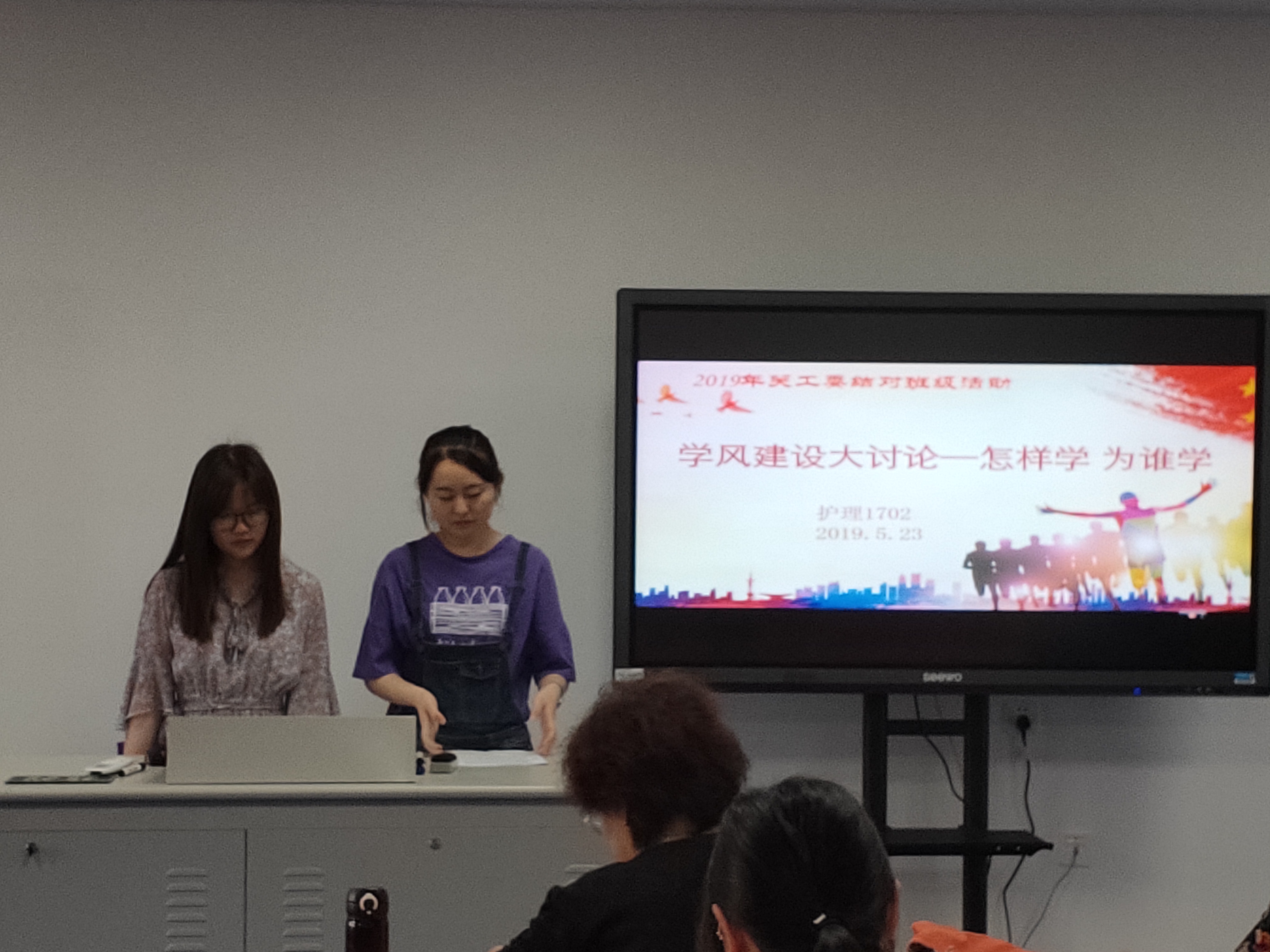2019年5月23日上午远程教室,护理1702班全体同学和淮海路离退休党支部老同志共同开展了班级结对活动——学风建设大讨论 怎么学 为谁学,淮海路离退休党支部季全兰,金巧秀老师以及班主任卢老师参加了此次活动。