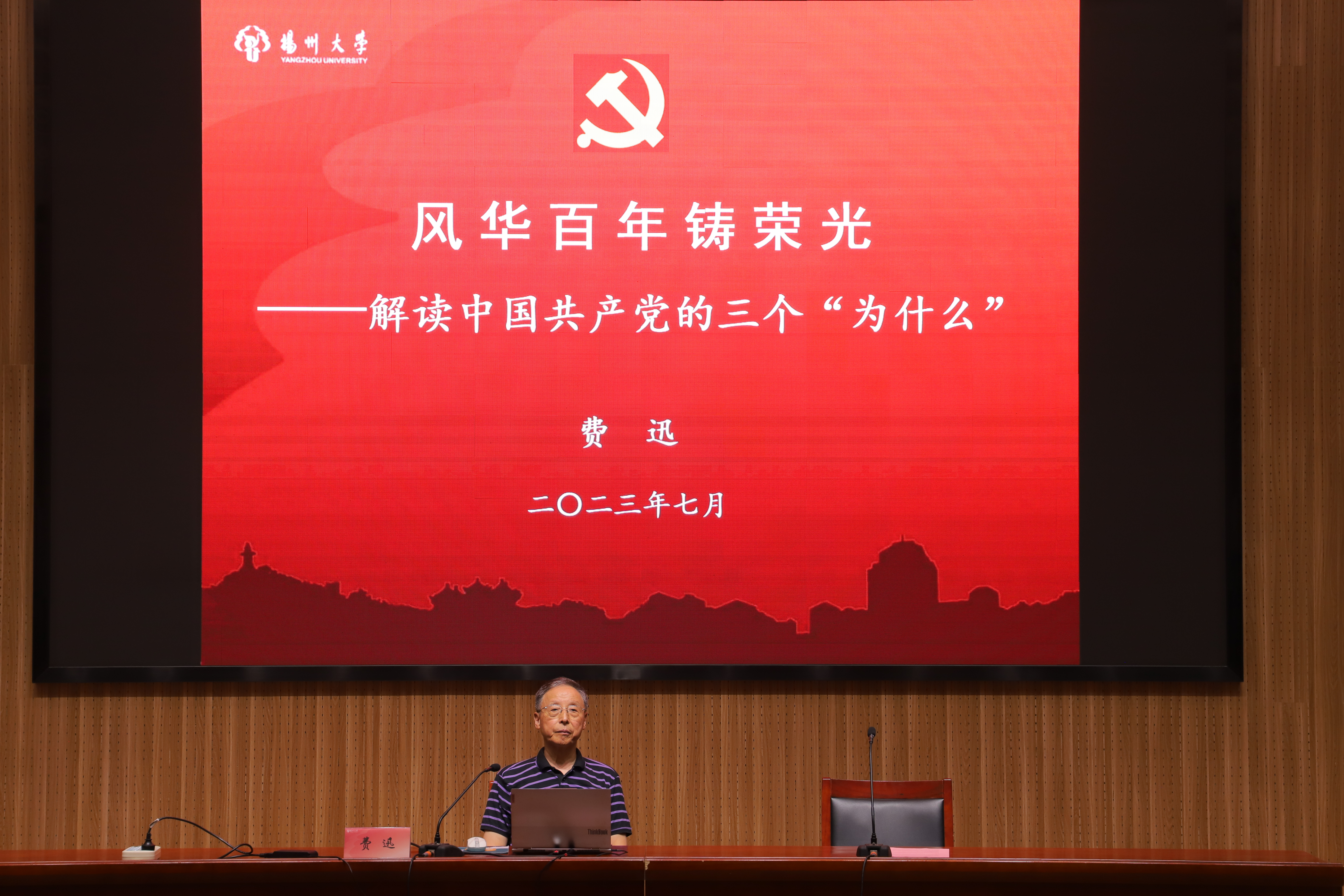 费迅教授从中国共产党为什么“生”、中国共产党为什么“干”、中国共产党为什么“能”三个维度,通过大量的党史材料和理论研究,为同学们详细解读了中国共产党的百年历程。他提到,中国共产党的诞生在思想上和客观上都具有历史必然性;他指出,中国共产党始终践行初心使命,不断加强自身建设,坚守信仰,扎根人民;他强调,同学们要立志做有理想、敢担当、能吃苦、肯奋斗的新时代好青年,为中国式现代化的实现做出自己的贡献。