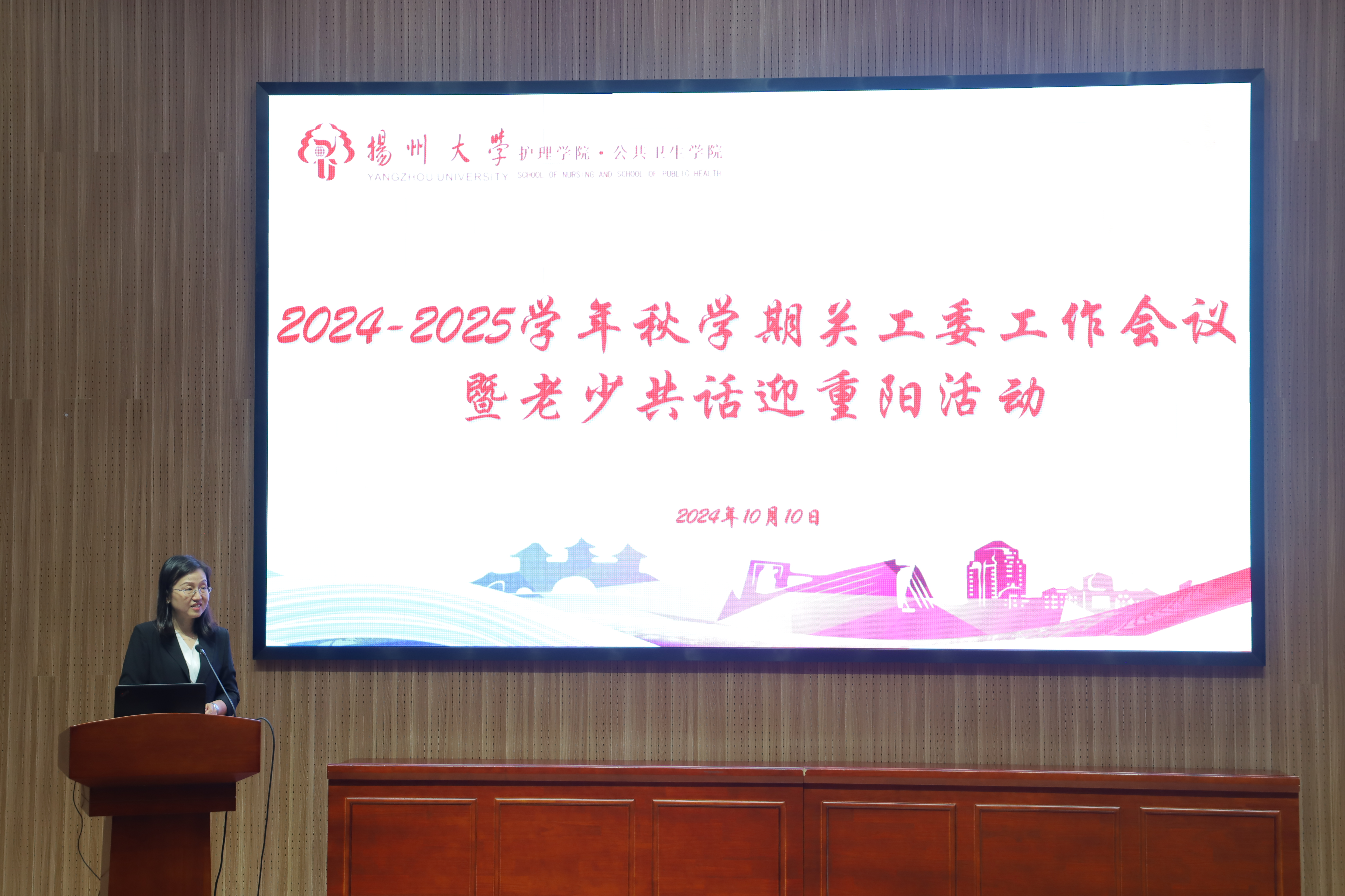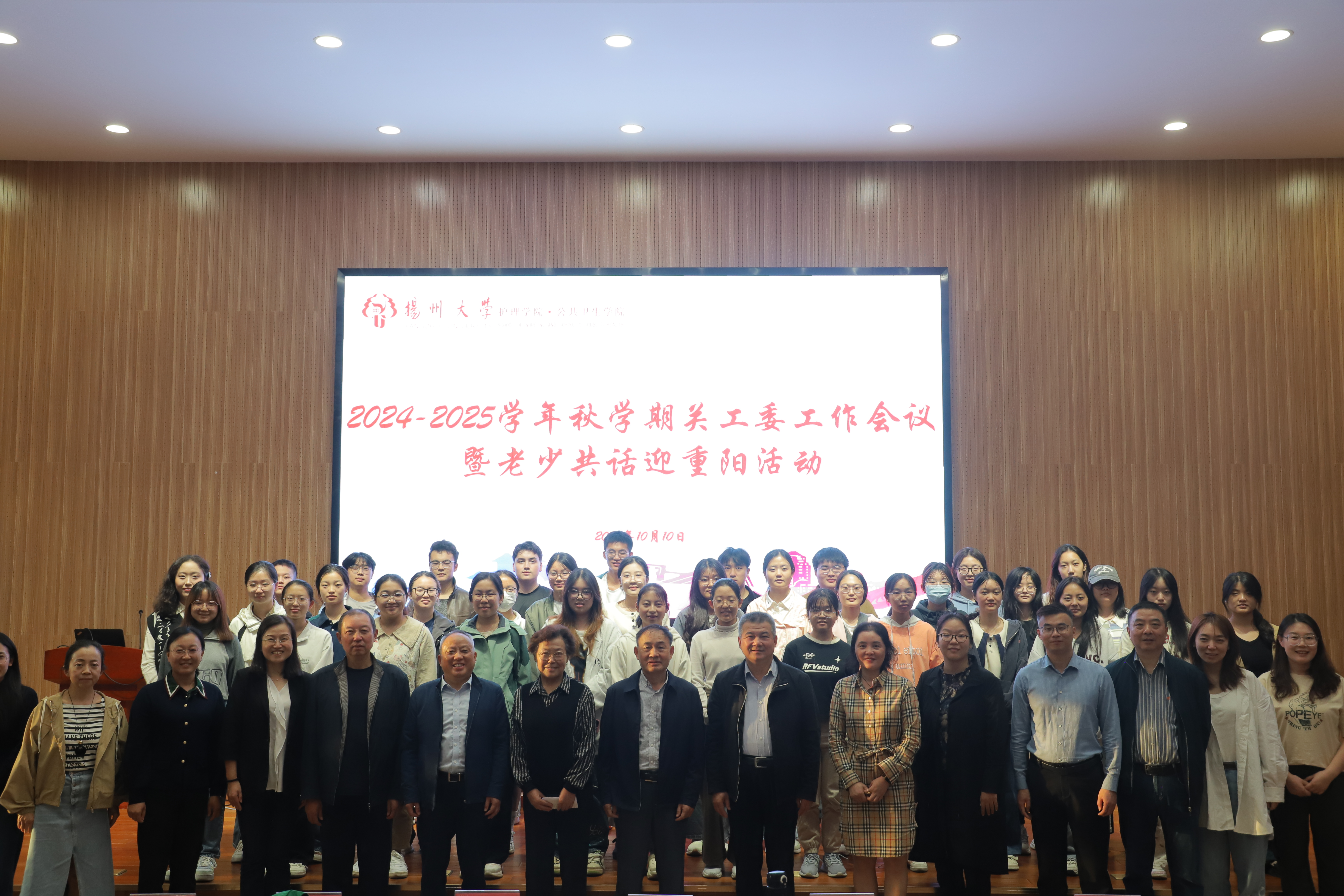 岁岁重阳,今又重阳。10月10日下午,我院在毓贤楼三楼报告厅、荷花池一楼教职工餐厅开展2024-2025学年秋学期关工委工作会议暨老少共话迎重阳活动。活动特邀校关工委驻会副主任、秘书长李士庭,校关工委办公室主任兼副秘书长刘汉柏,校关工委办公室秘书王琳,院关工委常务副主任、淮海路离退休第二党支部书记季全兰,学院退休老师、院关工委副主任孙峰,院党委书记、院关工委名誉主任刘红斌,副院长、院关工委副主任王芬以及学院关心下一代工作委员会全体成员与共建班级护理2301班的全体同学,活动由院党委副书记邹明玮主持。