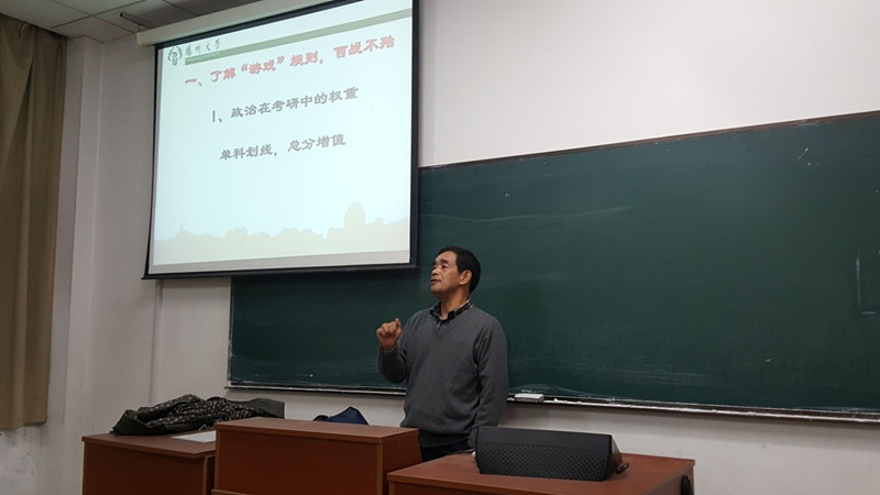 张扣林教授从以下几个方面详细介绍了政治考研知识要点:1.考研政治各部分知识点所占比例。 2.阅卷老师评分细则。3.答题技巧。4.今年考研政治热点问题:生态文明、孙中山辛亥革命、红军长征等等。 5.复习方法:如何整理归纳各大会议、重要事件、毛泽东著作等等。讲座气氛活跃,同学们受益颇多,增强了考研的信心。