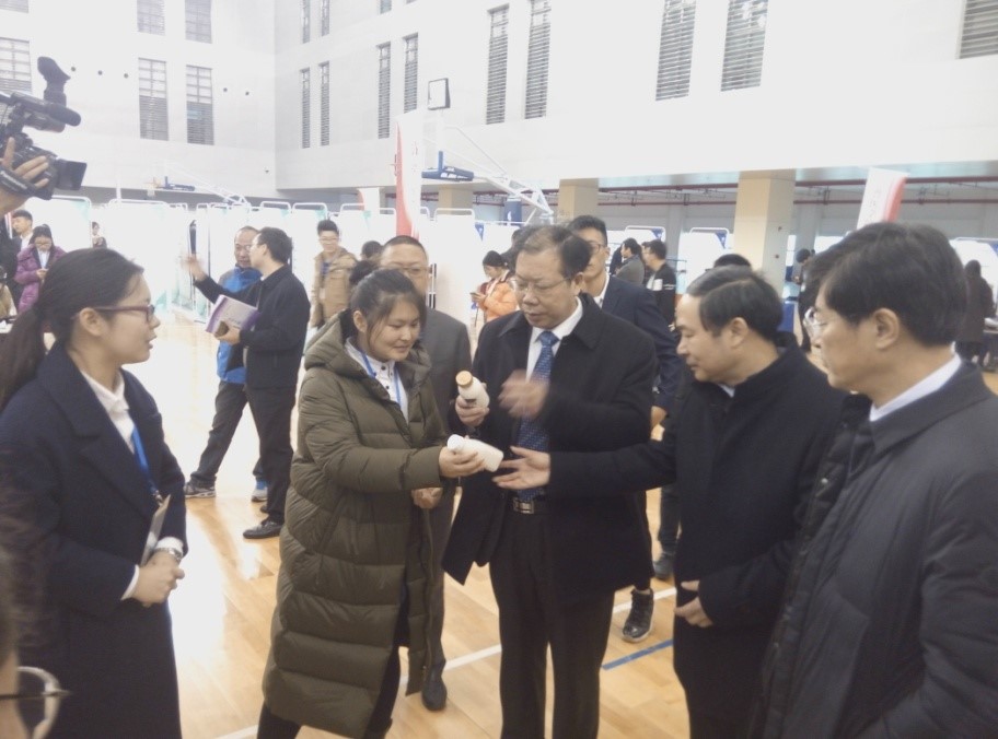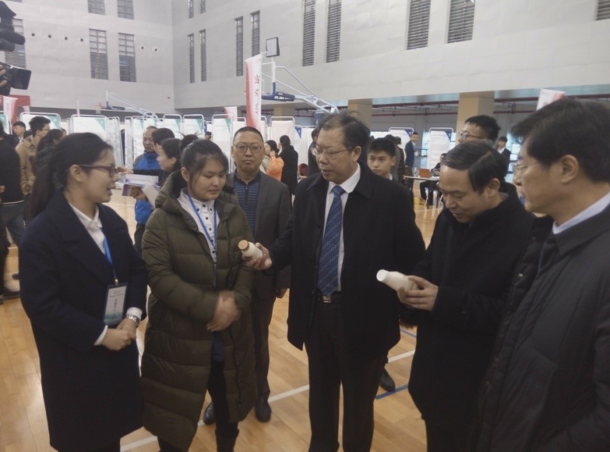 在项目展示现场,校党委书记姚冠新、校长焦新安、校党委副书记副校长叶柏森与我院参赛选手亲切交谈,询问项目情况。