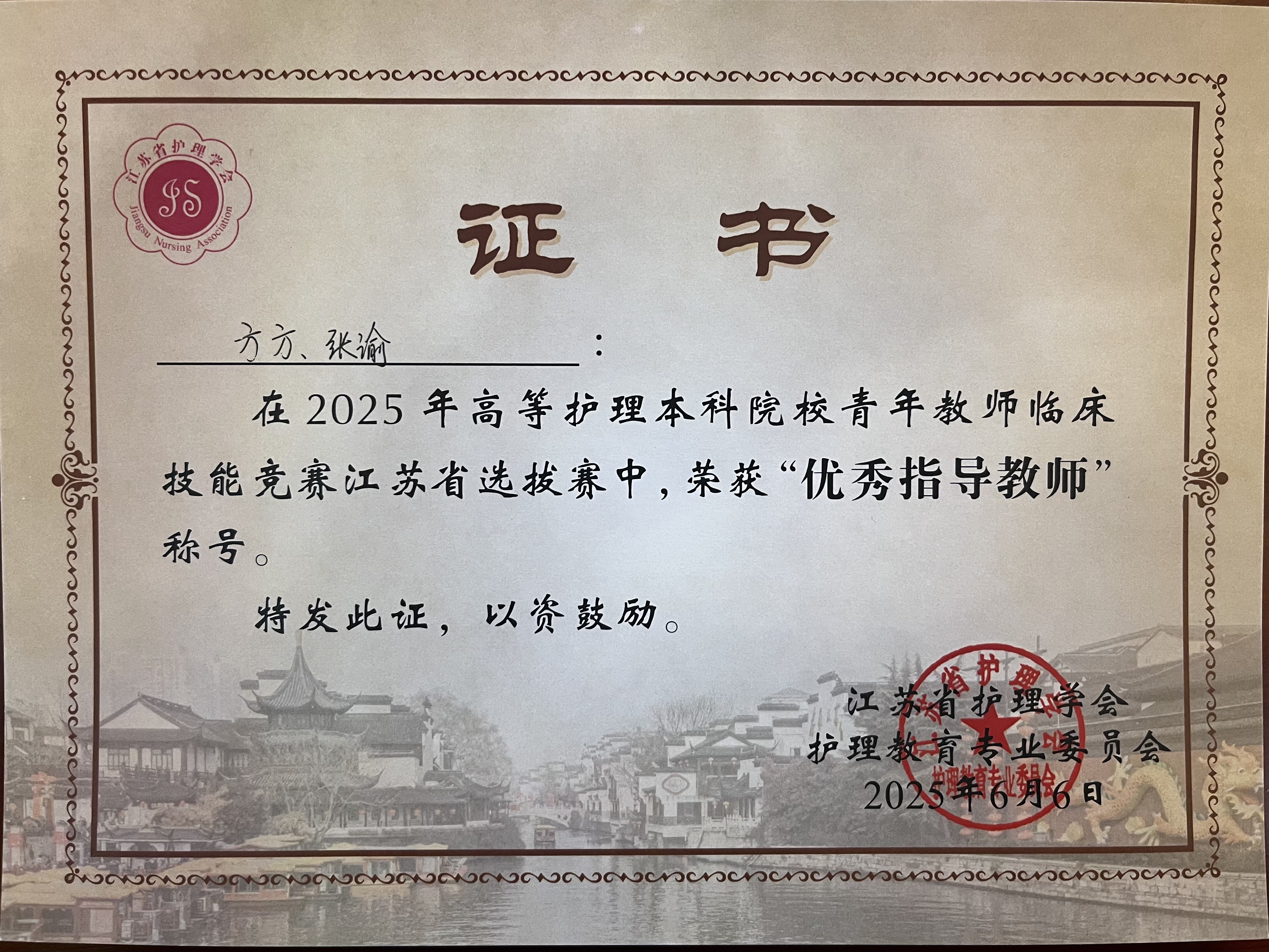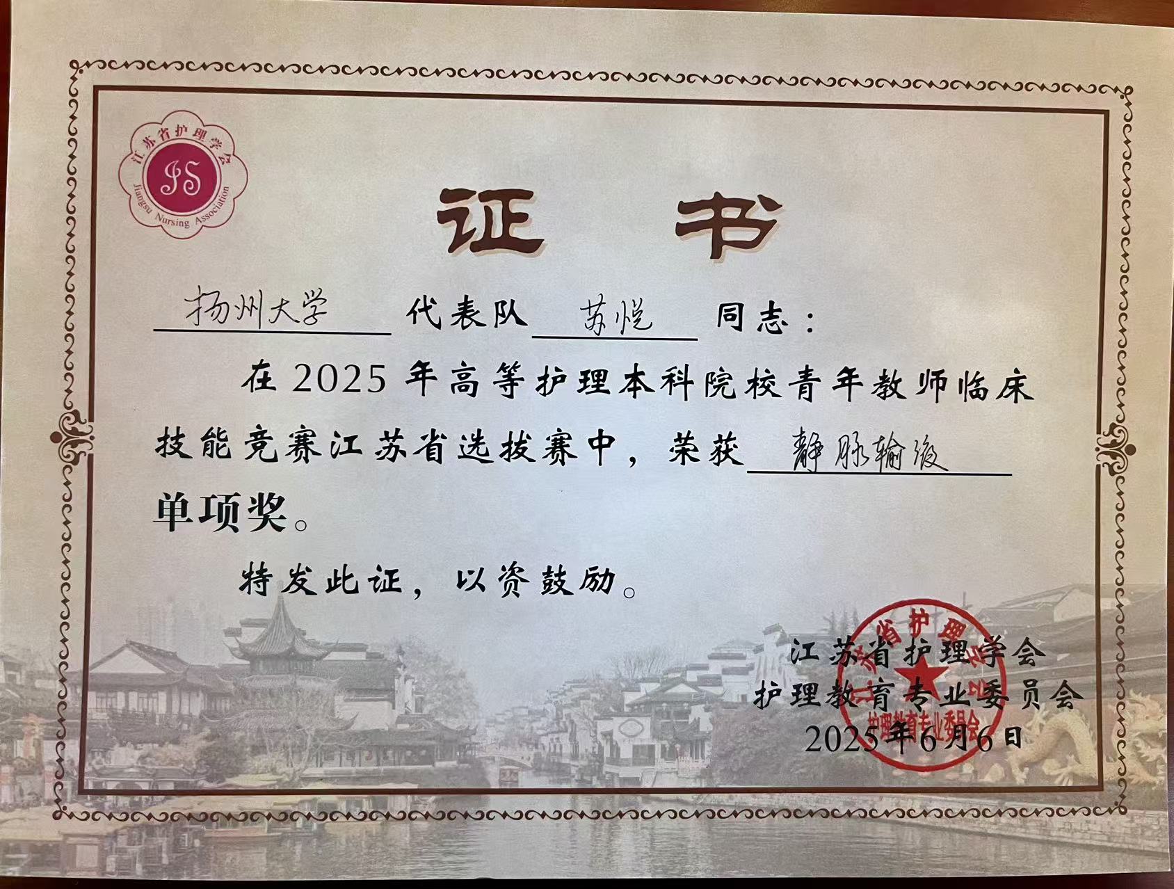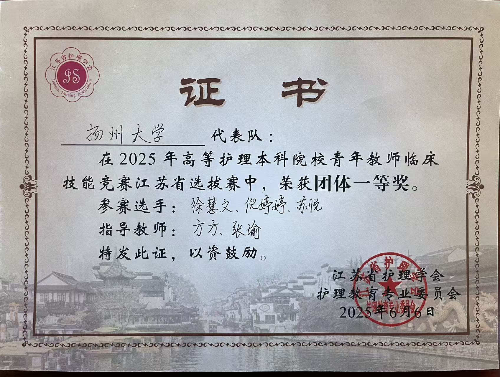 在2025年6月6日举办的江苏省高等护理本科院校青年教师临床技能大赛中,由祝娉婷副院长领队,我院青年教师凭借扎实的专业技能、出色的临场发挥和默契的团队协作,斩获团体一等奖的优异成绩!