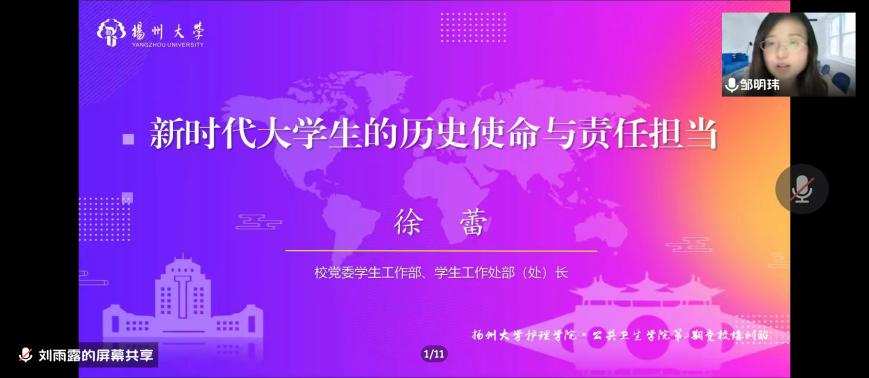 5月6日晚,我院分党校举办第二期党校培训第三讲,特邀扬州大学党委学生工作部、学生工作处部(处)长徐蕾为大家作“新时代大学生的历史使命与责任担当”的专题党课培训。会议由院党委副书记邹明玮主持。