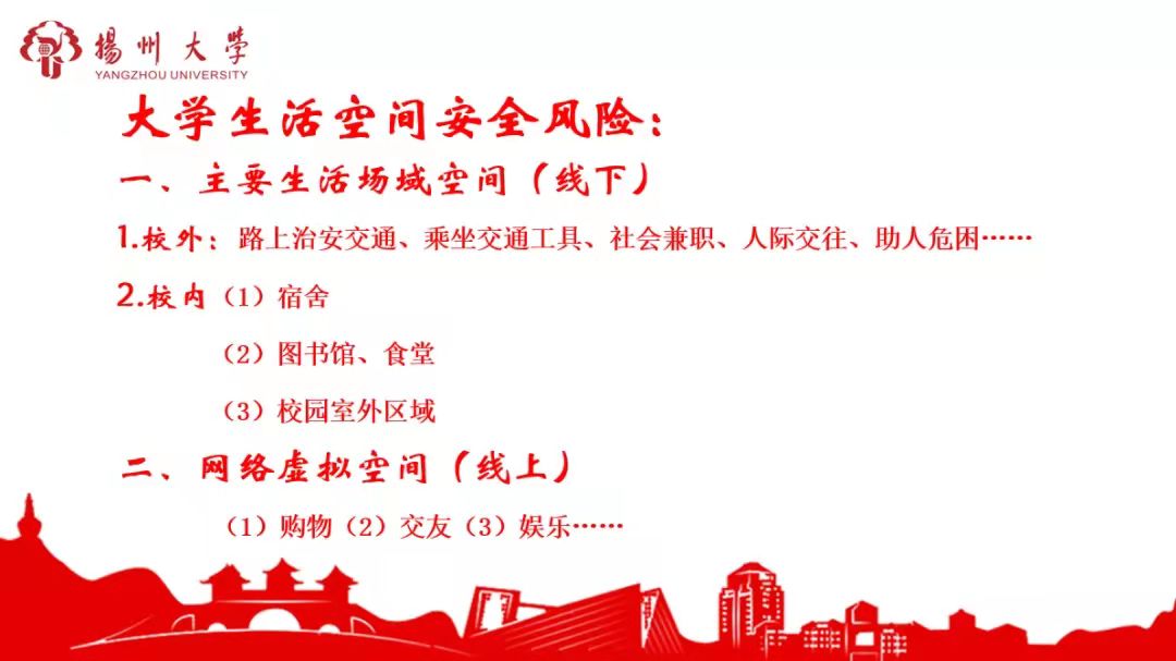 首先,郭处长向同学们指出了安全的重要性,又介绍了安全问题的多样性并跟我们讲述进行安全教育的重要性。她从主要生活场域空间(线下)的安全和网络虚拟空间(线上)的安全两方面入手,跟我们讲解隐藏在生活中每一个角落的安全隐患,她提醒大家:在安全问题上我们必须要做到防范在先,警惕在前,必须要警于思,合于规,慎于行,必须要树立高度的安全意识,筑起思想、行为、生命的安全长城。