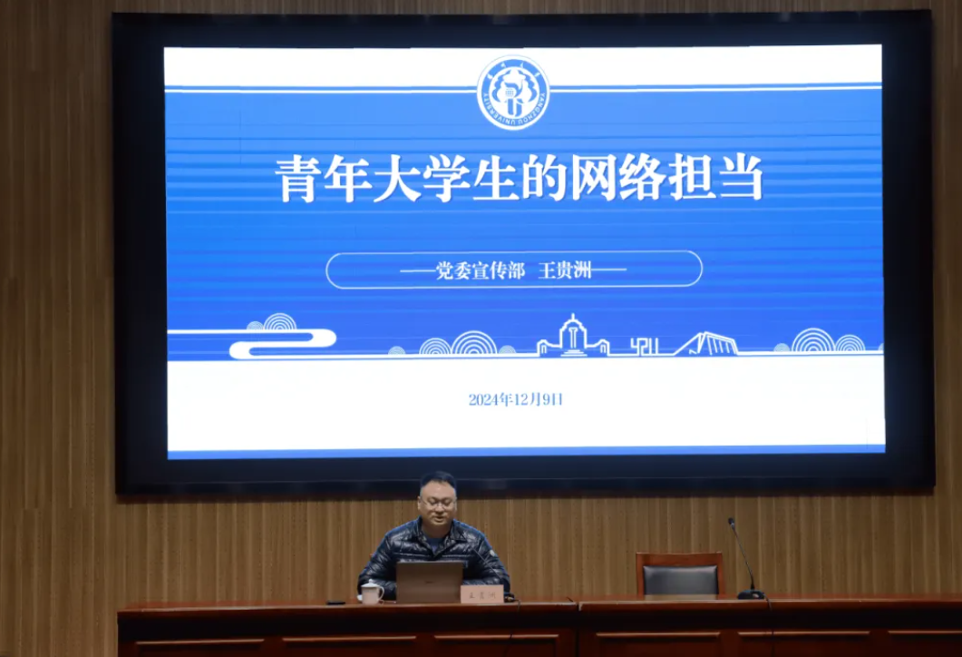 12月9日下午四时,我院举办网络文明和意识形态教育暨考风考纪动员和学生干部业务培训大会,邀请校党委宣传部网络宣传科科长王贵洲做培训。院党委副书记邹明玮、辅导员、全体学生党员、本科生、研究生党团班各班班委参加此次会议。会议由院团委书记卢遥主持。