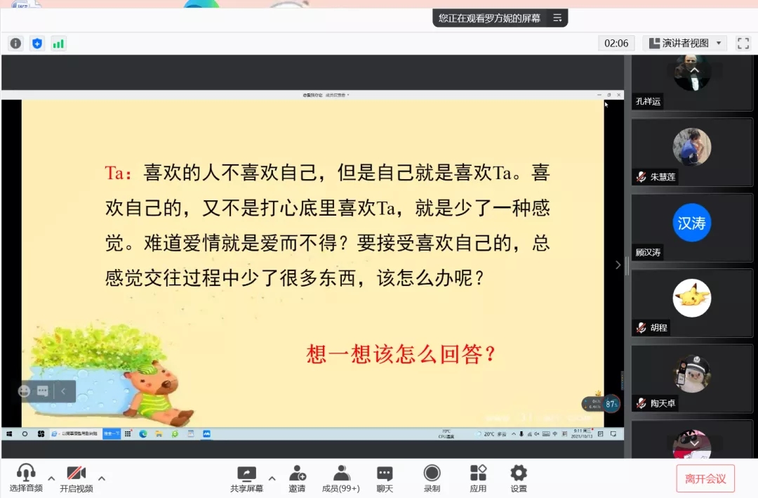 最后,针对男女生思维、生理等方面的差异,罗老师结合具体实例向大家讲解了恋爱相处指南,倡导同学们在恋爱中用乐观的心态,彼此信任。讲座结束后,罗老师还提供了心理咨询热线,鼓励有情感疑惑、心理烦恼的同学致电咨询。