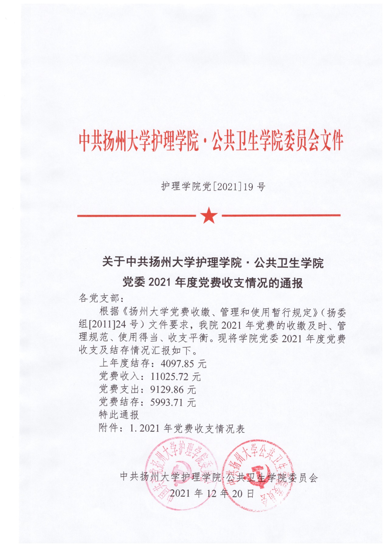 关于中共护理学院·公共卫生学院党委2021年度党费收支情况的通报