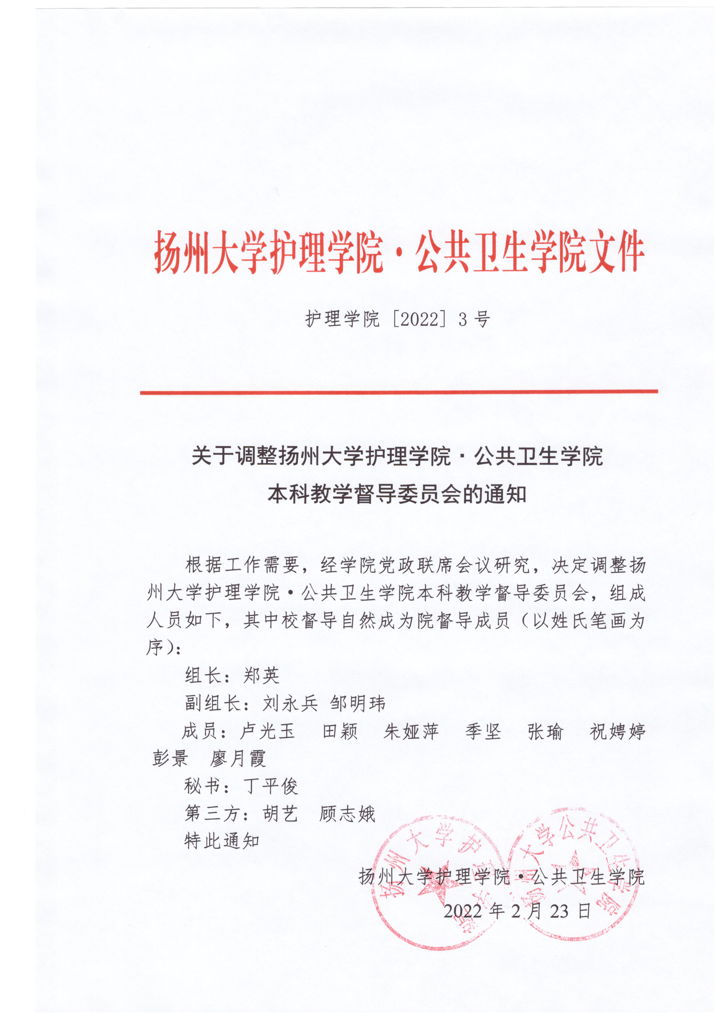 关于调整扬州大学护理学院·公共卫生学院 本科教学督导委员会的通知
