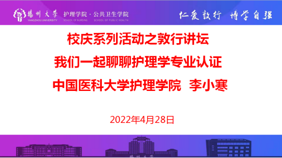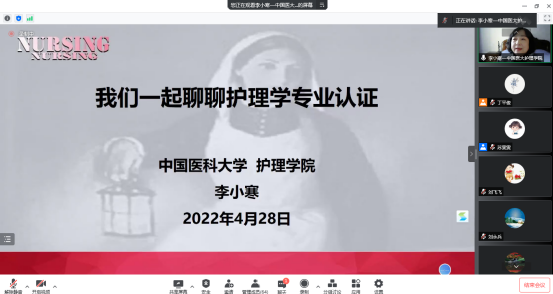 为做好护理学专业认证的准备工作,4月28日下午,学院特邀教育部高等学校护理学专业教学指导委员会委员、中国医科大学护理学院院长李小寒教授线上为我院教师作题为《我们一起聊聊护理学专业认证》的主题讲座,学院院长郑英及全体专兼职教师共70余人参加了此次活动,副院长刘永兵主持该活动。