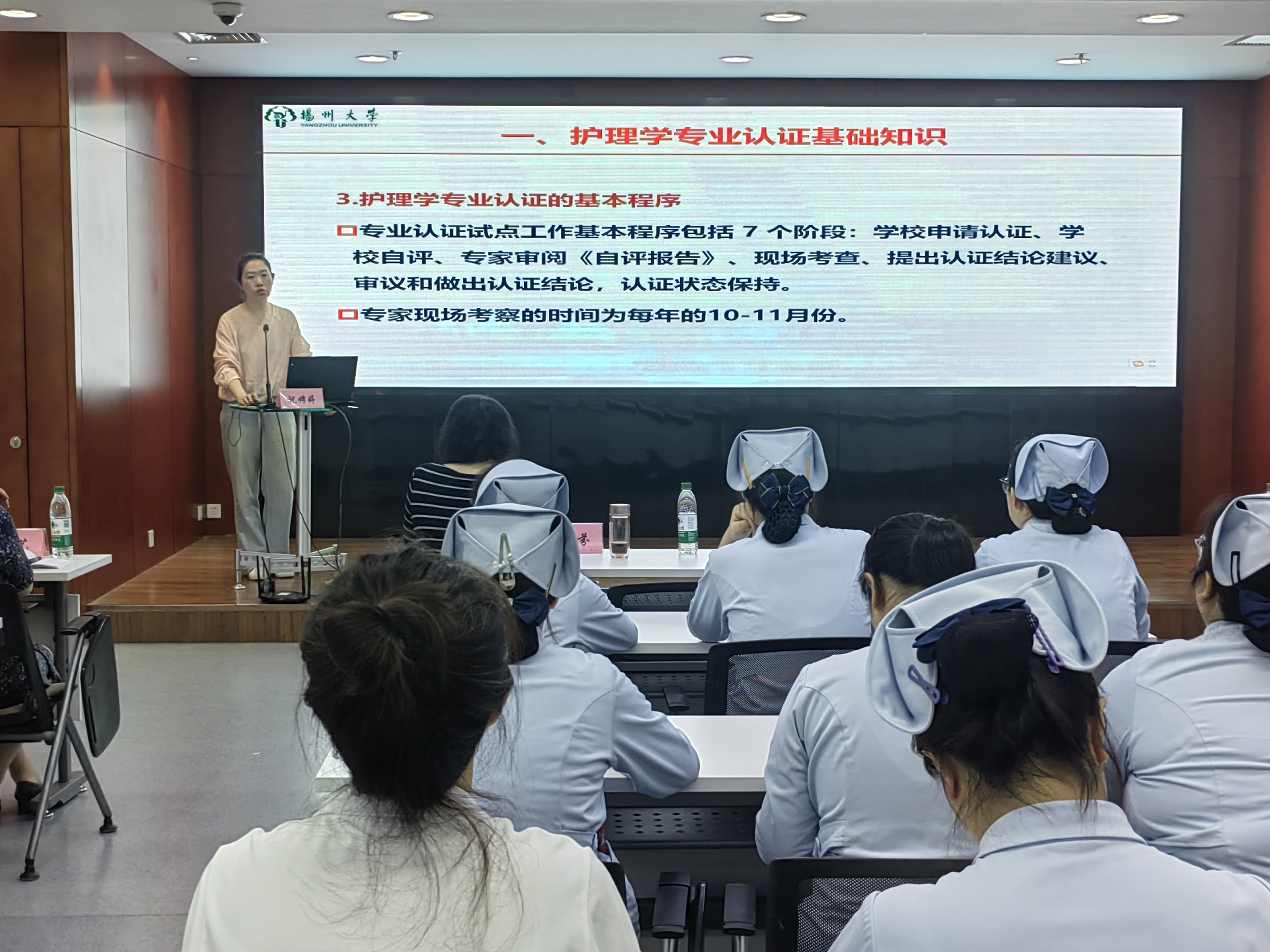 会上,首先由学院副院长祝娉婷进行了认证知识宣讲,介绍了护理学专业认证的背景和流程、专业认证的重要性、学院本科护理教育情况,并对照护理学类教学质量国家标准进行了护理学专业认证标准以及附院医院专家现场考察重要事项等进行了深刻解读和详细指导,她提出,附属医院需要继续完善临床教学专业认证工作的准备,进一步挖掘,彰显附属医院护理的教学特色,注重护理学科和其他学科的交叉融合;随后,护理部袁媛主任分别从护理教学管理、临床护理教学查房情况、临床教学与评价、学科与专科一体化建设等方面汇报了附属医院的情况。