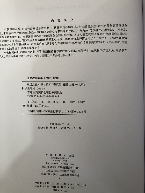 《现场急救知识与技术》主编 窦英茹 张菁,科学出版社.2018.