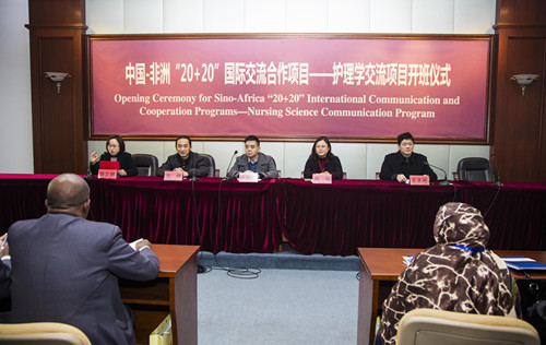 2015年11月30日上午,中非“20+20”国际交流合作项目——护理学交流项目开班仪式在校行政楼一楼隆重举行,此次中非“20+20”护理学交流项目分为护理教学研讨会和临床护理技能培训班两部分,共有55名来自于苏丹不同院校的师生参与。